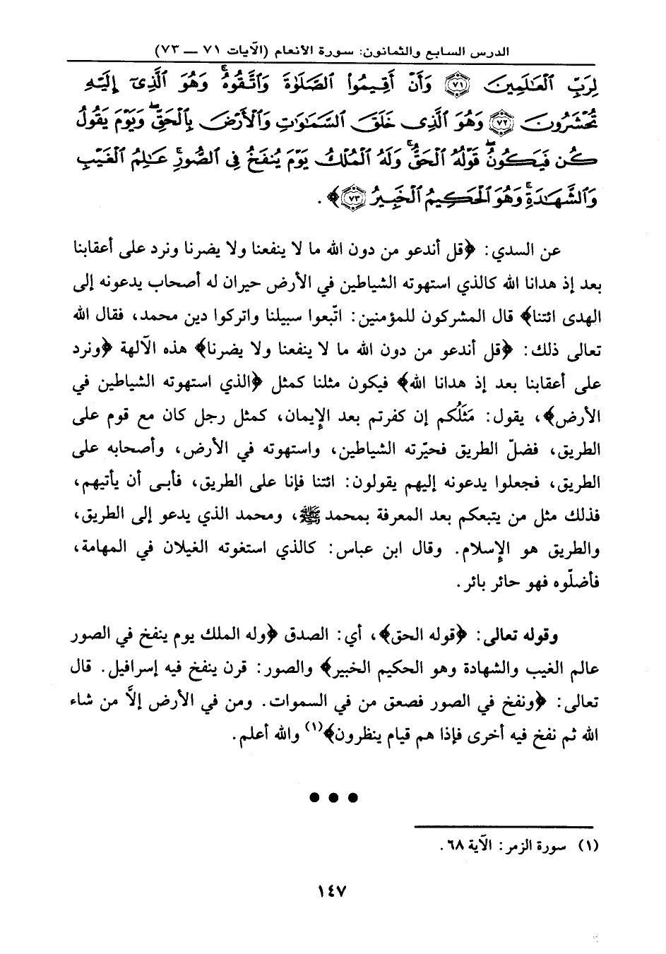لِرَبِّ الْعَالَمِينَ (71) وَأَنْ أَقِيمُواْ الصَّلاةَ وَاتَّقُوهُ وَهُوَ الَّذِيَ إِلَيْهِ تُحْشَرُونَ (72) وَهُوَ الَّذِي خَلَقَ السَّمَاوَاتِ وَالأَرْضَ بِالْحَقِّ وَيَوْمَ يَقُولُ كُن فَيَكُونُ قَوْلُهُ الْحَقُّ وَلَهُ الْمُلْكُ يَوْمَ يُنفَخُ فِي الصُّوَرِ عَالِمُ الْغَيْبِ وَالشَّهَادَةِ وَهُوَ الْحَكِيمُ الْخَبِيرُ (73) } .