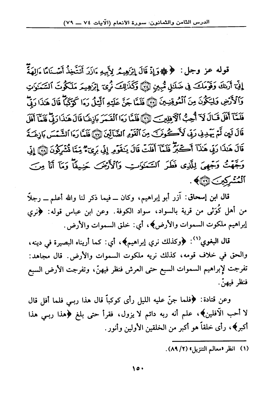 قال ابن إسحاق: آزر أبو إبراهيم. وكان - فيما ذكر لنا والله أعلم - رجلاً من أهل كُوَثى من قرية بالسواد، سواد الكوفة. وعن ابن عباس: قوله: {نُرِي إِبْرَاهِيمَ مَلَكُوتَ السَّمَاوَاتِ وَالأَرْضِ} ، أي: خلق السماوات والأرض.
