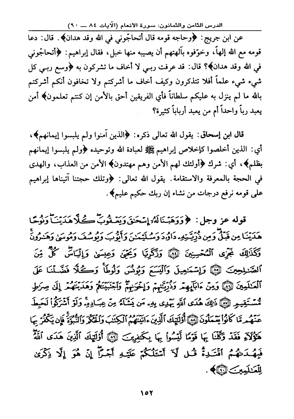 وَكَذَلِكَ نَجْزِي الْمُحْسِنِينَ (84) وَزَكَرِيَّا وَيَحْيَى وَعِيسَى وَإِلْيَاسَ كُلٌّ مِّنَ الصَّالِحِينَ (85) وَإِسْمَاعِيلَ وَالْيَسَعَ وَيُونُسَ وَلُوطاً وَكُلاًّ فضَّلْنَا عَلَى الْعَالَمِينَ (86) وَمِنْ آبَائِهِمْ وَذُرِّيَّاتِهِمْ وَإِخْوَانِهِمْ وَاجْتَبَيْنَاهُمْ وَهَدَيْنَاهُمْ إِلَى صِرَاطٍ مُّسْتَقِيمٍ (87) ذَلِكَ هُدَى اللهِ يَهْدِي بِهِ مَن يَشَاءُ مِنْ عِبَادِهِ وَلَوْ أَشْرَكُواْ لَحَبِطَ عَنْهُم مَّا كَانُواْ يَعْمَلُونَ (88) أُوْلَئِكَ الَّذِينَ آتَيْنَاهُمُ الْكِتَابَ وَالْحُكْمَ وَالنُّبُوَّةَ فَإِن يَكْفُرْ بِهَا هَؤُلاء فَقَدْ وَكَّلْنَا بِهَا قَوْماً لَّيْسُواْ بِهَا بِكَافِرِينَ (89) أُوْلَئِكَ الَّذِينَ هَدَى اللهُ فَبِهُدَاهُمُ اقْتَدِهْ قُل لاَّ أَسْأَلُكُمْ عَلَيْهِ أَجْراً إِنْ هُوَ إِلاَّ ذِكْرَى لِلْعَالَمِينَ (90) } .