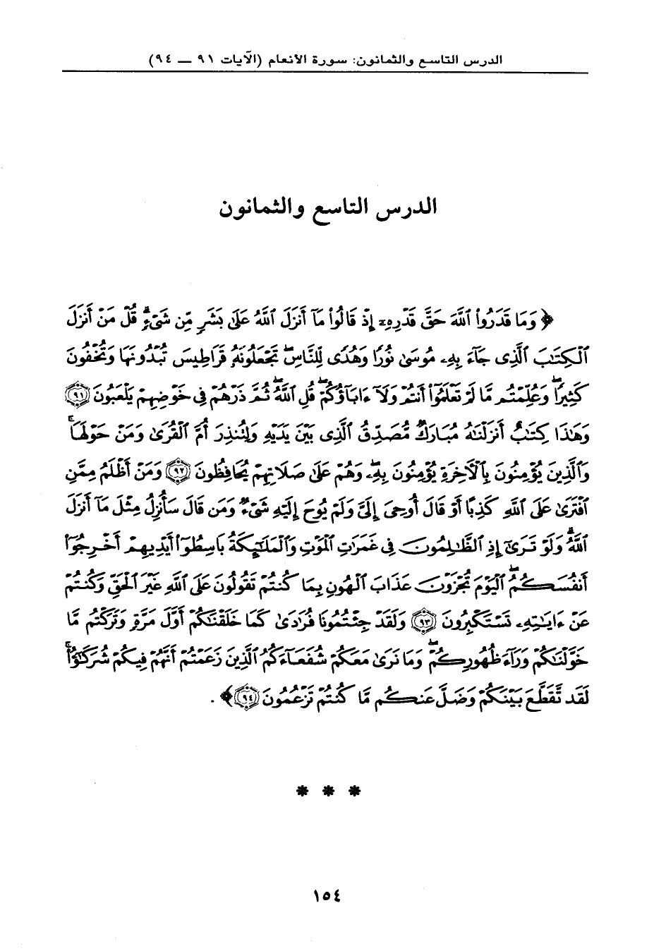 {وَمَا قَدَرُواْ اللهَ حَقَّ قَدْرِهِ إِذْ قَالُواْ مَا أَنزَلَ اللهُ عَلَى بَشَرٍ مِّن شَيْءٍ قُلْ مَنْ أَنزَلَ الْكِتَابَ الَّذِي جَاء بِهِ مُوسَى نُوراً وَهُدًى لِّلنَّاسِ تَجْعَلُونَهُ قَرَاطِيسَ تُبْدُونَهَا وَتُخْفُونَ كَثِيراً وَعُلِّمْتُم مَّا لَمْ تَعْلَمُواْ أَنتُمْ وَلاَ آبَاؤُكُمْ قُلِ اللهُ ثُمَّ ذَرْهُمْ فِي خَوْضِهِمْ يَلْعَبُونَ (91) وَهَذَا كِتَابٌ أَنزَلْنَاهُ مُبَارَكٌ مُّصَدِّقُ الَّذِي بَيْنَ يَدَيْهِ وَلِتُنذِرَ أُمَّ الْقُرَى وَمَنْ حَوْلَهَا وَالَّذِينَ يُؤْمِنُونَ بِالآخِرَةِ يُؤْمِنُونَ بِهِ وَهُمْ عَلَى صَلاَتِهِمْ يُحَافِظُونَ (92) وَمَنْ أَظْلَمُ مِمَّنِ افْتَرَى عَلَى اللهِ كَذِباً أَوْ قَالَ أُوْحِيَ إِلَيَّ وَلَمْ يُوحَ إِلَيْهِ شَيْءٌ وَمَن قَالَ سَأُنزِلُ مِثْلَ مَا أَنَزلَ اللهُ وَلَوْ تَرَى إِذِ الظَّالِمُونَ فِي غَمَرَاتِ الْمَوْتِ وَالْمَلآئِكَةُ بَاسِطُواْ أَيْدِيهِمْ أَخْرِجُواْ أَنفُسَكُمُ الْيَوْمَ تُجْزَوْنَ عَذَابَ الْهُونِ بِمَا كُنتُمْ تَقُولُونَ عَلَى اللهِ غَيْرَ الْحَقِّ وَكُنتُمْ عَنْ آيَاتِهِ تَسْتَكْبِرُونَ (93) وَلَقَدْ جِئْتُمُونَا فُرَادَى كَمَا خَلَقْنَاكُمْ أَوَّلَ مَرَّةٍ وَتَرَكْتُم مَّا خَوَّلْنَاكُمْ وَرَاء ظُهُورِكُمْ وَمَا نَرَى مَعَكُمْ شُفَعَاءكُمُ الَّذِينَ زَعَمْتُمْ أَنَّهُمْ فِيكُمْ شُرَكَاء لَقَد تَّقَطَّعَ بَيْنَكُمْ وَضَلَّ عَنكُم مَّا كُنتُمْ تَزْعُمُونَ (94) } .