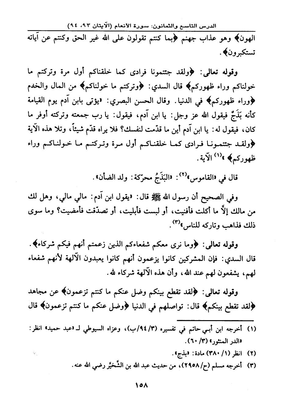 وقوله تعالى: {وَلَقَدْ جِئْتُمُونَا فُرَادَى كَمَا خَلَقْنَاكُمْ أَوَّلَ مَرَّةٍ وَتَرَكْتُم مَّا خَوَّلْنَاكُمْ وَرَاء ظُهُورِكُمْ} ، قال السدي: {وَتَرَكْتُم مَّا خَوَّلْنَاكُمْ} من المال والخدم {وَرَاء ظُهُورِكُمْ} في الدنيا. وقال الحسن البصري: (يؤتى بابن آدم يوم القيامة كأنه بَذَجٌ فيقول الله عز وجل: يا ابن آدم، فيقول: يا رب جمعته وتركته أوفر ما كان، فيقول له: يا ابن آدم أين ما قدّمت لنفسك؟ فلا يراه قدّم شيئًا، وتلا هذه الآية {وَلَقَدْ جِئْتُمُونَا فُرَادَى كَمَا خَلَقْنَاكُمْ أَوَّلَ مَرَّةٍ وَتَرَكْتُم مَّا خَوَّلْنَاكُمْ وَرَاء ظُهُورِكُمْ} ) الآية.