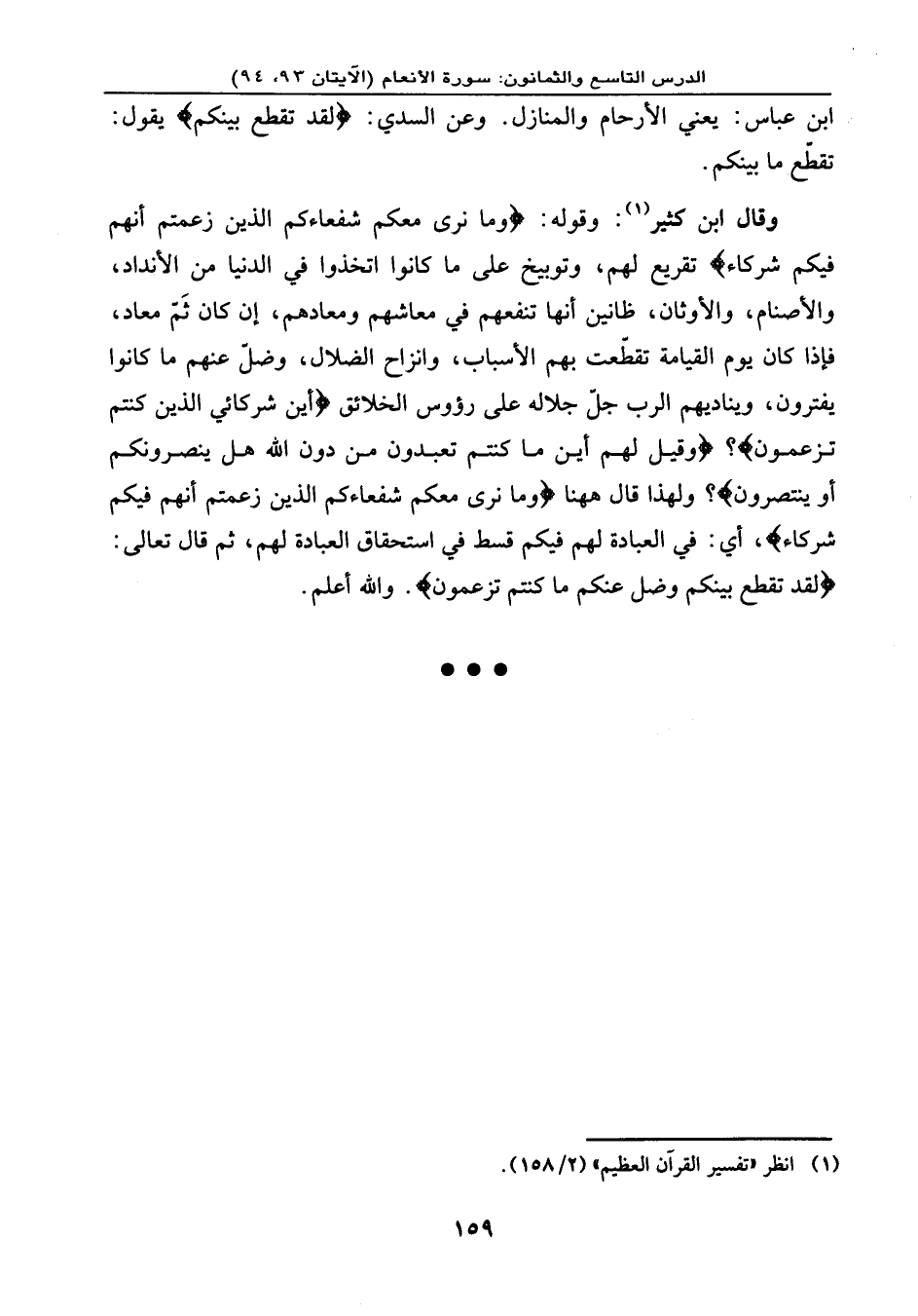 وقال ابن كثير: وقوله: {وَمَا نَرَى مَعَكُمْ شُفَعَاءَكُمُ الَّذِينَ زَعَمْتُمْ أَنَّهُمْ فِيكُمْ شُرَكَاءُ} تقريع لهم وتوبيخ على ما كانوا اتخذوا في الدنيا من الأنداد، والأصنام، والأوثان، ظانين أنها تنفعهم في معاشهم ومعادهم، إن كان ثَمَّ معاد، فإذا كان يوم القيامة تقطّعت بهم الأسباب، وانزاح الضلال، وضلّ عنهم ما كانوا يفترون، ويناديهم الرب، جلّ جلاله، على رءووس الخلائق: {أَيْنَ شُرَكَاؤُكُمُ الَّذِينَ كُنْتُمْ تَزْعُمُونَ} ؟ {وَقِيلَ لَهُمْ أَيْنَ مَا كُنْتُمْ تَعْبُدُونَ مِنْ دُونِ اللَّهِ هَلْ يَنْصُرُونَكُمْ أَوْ يَنْتَصِرُونَ} ؟ ولهذا قال ها هنا: {وَمَا نَرَى مَعَكُمْ شُفَعَاءَكُمُ الَّذِينَ زَعَمْتُمْ أَنَّهُمْ فِيكُمْ شُرَكَاءُ} ، أي: في العبادة لهم فيكم قسط في استحقاق العبادة لهم، ثم قال تعالى: {لَقَد تَّقَطَّعَ بَيْنَكُمْ وَضَلَّ عَنكُم مَّا كُنتُمْ تَزْعُمُونَ} . والله أعلم.