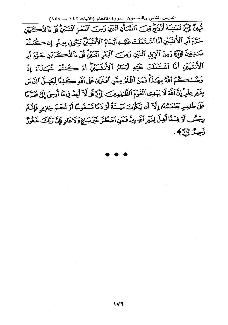 صَادِقِينَ (143) وَمِنَ الإِبْلِ اثْنَيْنِ وَمِنَ الْبَقَرِ اثْنَيْنِ قُلْ آلذَّكَرَيْنِ حَرَّمَ أَمِ الأُنثَيَيْنِ أَمَّا اشْتَمَلَتْ عَلَيْهِ أَرْحَامُ الأُنثَيَيْنِ أَمْ كُنتُمْ شُهَدَاء إِذْ وَصَّاكُمُ اللهُ بِهَذَا فَمَنْ أَظْلَمُ مِمَّنِ افْتَرَى عَلَى اللهِ كَذِباً لِيُضِلَّ النَّاسَ بِغَيْرِ عِلْمٍ إِنَّ اللهَ لاَ يَهْدِي الْقَوْمَ الظَّالِمِينَ (144) قُل لاَّ أَجِدُ فِي مَا أُوْحِيَ إِلَيَّ مُحَرَّماً عَلَى طَاعِمٍ يَطْعَمُهُ إِلاَّ أَن يَكُونَ مَيْتَةً أَوْ دَماً مَّسْفُوحاً أَوْ لَحْمَ خِنزِيرٍ فَإِنَّهُ رِجْسٌ أَوْ فِسْقاً أُهِلَّ لِغَيْرِ اللهِ بِهِ فَمَنِ اضْطُرَّ غَيْرَ بَاغٍ وَلاَ عَادٍ فَإِنَّ رَبَّكَ غَفُورٌ رَّحِيمٌ (145) } .