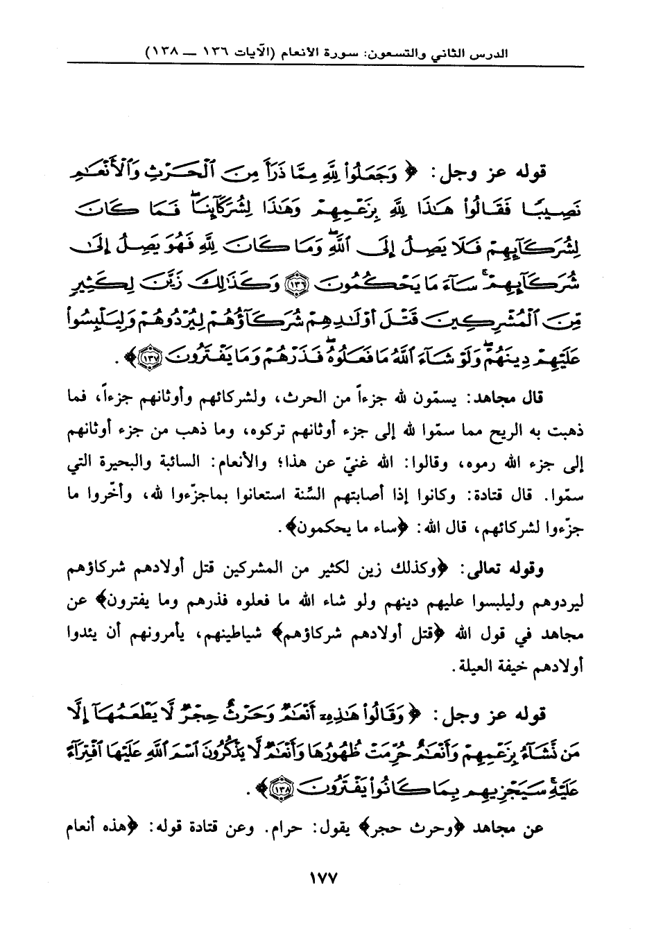 قوله عز وجل: {وَجَعَلُواْ لِلّهِ مِمِّا ذَرَأَ مِنَ الْحَرْثِ وَالأَنْعَامِ نَصِيباً فَقَالُواْ هَذَا لِلّهِ بِزَعْمِهِمْ وَهَذَا لِشُرَكَآئِنَا فَمَا كَانَ لِشُرَكَآئِهِمْ فَلاَ يَصِلُ إِلَى اللهِ وَمَا كَانَ لِلّهِ فَهُوَ يَصِلُ إِلَى شُرَكَآئِهِمْ سَاء مَا يَحْكُمُونَ (136) وَكَذَلِكَ زَيَّنَ لِكَثِيرٍ مِّنَ الْمُشْرِكِينَ قَتْلَ أَوْلاَدِهِمْ شُرَكَآؤُهُمْ لِيُرْدُوهُمْ وَلِيَلْبِسُواْ عَلَيْهِمْ دِينَهُمْ وَلَوْ شَاء اللهُ مَا فَعَلُوهُ فَذَرْهُمْ وَمَا يَفْتَرُونَ (137) } .