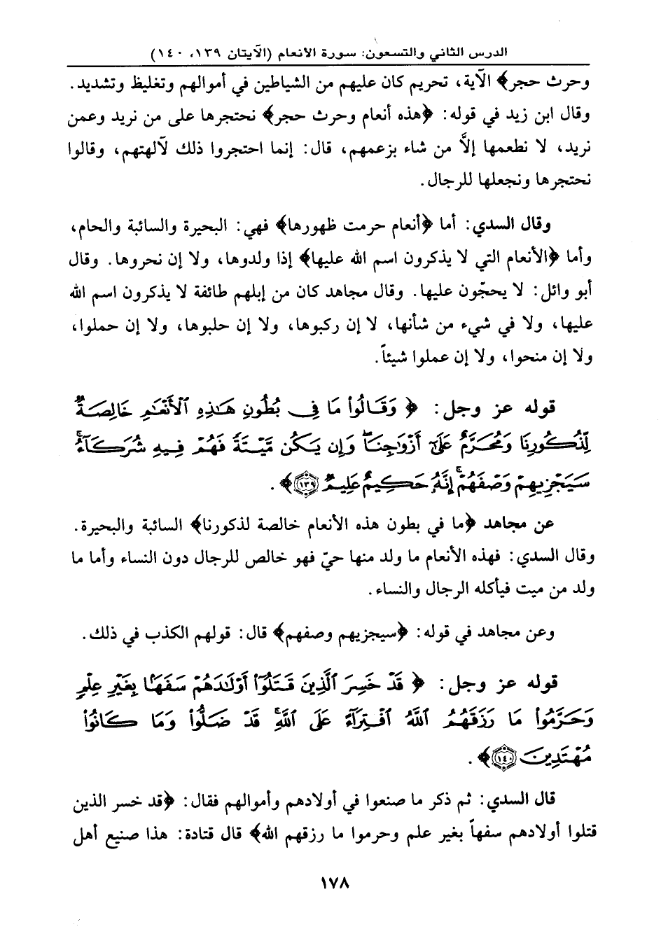 وَحَرْثٌ حِجْرٌ لاَّ يَطْعَمُهَا إِلاَّ مَن نّشَاء بِزَعْمِهِمْ وَأَنْعَامٌ حُرِّمَتْ ظُهُورُهَا وَأَنْعَامٌ لاَّ يَذْكُرُونَ اسْمَ اللهِ عَلَيْهَا افْتِرَاء عَلَيْهِ سَيَجْزِيهِم بِمَا كَانُواْ يَفْتَرُونَ (138) } .