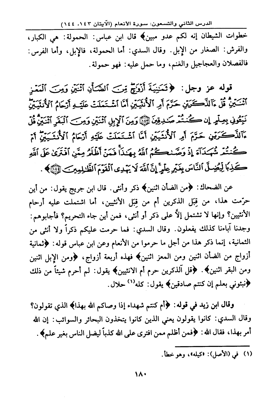قوله عز وجل: {ثَمَانِيَةَ أَزْوَاجٍ مِّنَ الضَّأْنِ اثْنَيْنِ وَمِنَ الْمَعْزِ اثْنَيْنِ قُلْ آلذَّكَرَيْنِ حَرَّمَ أَمِ الأُنثَيَيْنِ أَمَّا اشْتَمَلَتْ عَلَيْهِ أَرْحَامُ الأُنثَيَيْنِ نَبِّؤُونِي بِعِلْمٍ إِن كُنتُمْ صَادِقِينَ (143) وَمِنَ الإِبْلِ اثْنَيْنِ وَمِنَ الْبَقَرِ اثْنَيْنِ قُلْ آلذَّكَرَيْنِ حَرَّمَ أَمِ الأُنثَيَيْنِ أَمَّا اشْتَمَلَتْ عَلَيْهِ أَرْحَامُ الأُنثَيَيْنِ أَمْ كُنتُمْ شُهَدَاء إِذْ وَصَّاكُمُ اللهُ بِهَذَا فَمَنْ أَظْلَمُ مِمَّنِ افْتَرَى عَلَى اللهِ كَذِباً لِيُضِلَّ النَّاسَ بِغَيْرِ عِلْمٍ إِنَّ اللهَ لاَ يَهْدِي الْقَوْمَ الظَّالِمِينَ (144) } .