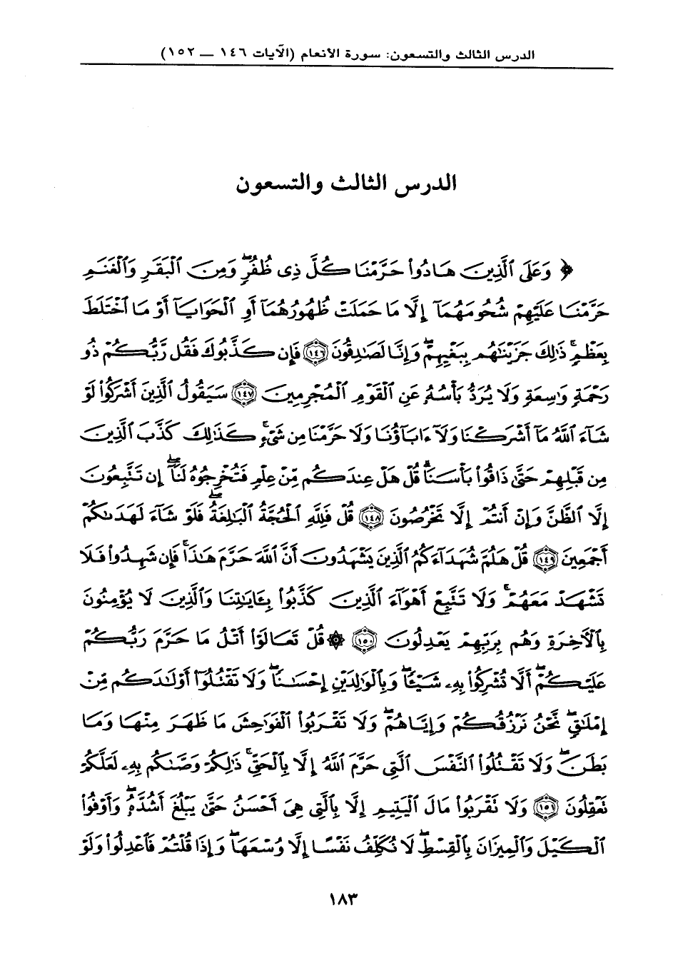 {وَعَلَى الَّذِينَ هَادُواْ حَرَّمْنَا كُلَّ ذِي ظُفُرٍ وَمِنَ الْبَقَرِ وَالْغَنَمِ حَرَّمْنَا عَلَيْهِمْ شُحُومَهُمَا إِلاَّ مَا حَمَلَتْ ظُهُورُهُمَا أَوِ الْحَوَايَا أَوْ مَا اخْتَلَطَ بِعَظْمٍ ذَلِكَ جَزَيْنَاهُم بِبَغْيِهِمْ وِإِنَّا لَصَادِقُونَ (146) فَإِن كَذَّبُوكَ فَقُل رَّبُّكُمْ ذُو رَحْمَةٍ وَاسِعَةٍ وَلاَ يُرَدُّ بَأْسُهُ عَنِ الْقَوْمِ الْمُجْرِمِينَ (147) سَيَقُولُ الَّذِينَ أَشْرَكُواْ لَوْ شَاء اللهُ مَا أَشْرَكْنَا وَلاَ آبَاؤُنَا وَلاَ حَرَّمْنَا مِن شَيْءٍ كَذَلِكَ كَذَّبَ الَّذِينَ مِن قَبْلِهِم حَتَّى ذَاقُواْ بَأْسَنَا قُلْ هَلْ عِندَكُم مِّنْ عِلْمٍ فَتُخْرِجُوهُ لَنَا إِن تَتَّبِعُونَ إِلاَّ الظَّنَّ وَإِنْ أَنتُمْ إَلاَّ تَخْرُصُونَ (148) قُلْ فَلِلّهِ الْحُجَّةُ الْبَالِغَةُ فَلَوْ شَاء لَهَدَاكُمْ أَجْمَعِينَ (149) قُلْ هَلُمَّ شُهَدَاءكُمُ الَّذِينَ يَشْهَدُونَ أَنَّ اللهَ حَرَّمَ هَذَا فَإِن شَهِدُواْ فَلاَ تَشْهَدْ مَعَهُمْ وَلاَ تَتَّبِعْ أَهْوَاء الَّذِينَ كَذَّبُواْ بِآيَاتِنَا وَالَّذِينَ لاَ يُؤْمِنُونَ بِالآخِرَةِ وَهُم بِرَبِّهِمْ يَعْدِلُونَ (150) قُلْ تَعَالَوْاْ أَتْلُ مَا حَرَّمَ رَبُّكُمْ عَلَيْكُمْ أَلاَّ تُشْرِكُواْ بِهِ شَيْئاً وَبِالْوَالِدَيْنِ إِحْسَاناً وَلاَ تَقْتُلُواْ أَوْلاَدَكُم مِّنْ إمْلاَقٍ نَّحْنُ نَرْزُقُكُمْ وَإِيَّاهُمْ وَلاَ تَقْرَبُواْ الْفَوَاحِشَ مَا ظَهَرَ مِنْهَا وَمَا بَطَنَ وَلاَ تَقْتُلُواْ النَّفْسَ الَّتِي حَرَّمَ اللهُ إِلاَّ بِالْحَقِّ ذَلِكُمْ وَصَّاكُمْ بِهِ لَعَلَّكُمْ تَعْقِلُونَ (151) وَلاَ تَقْرَبُواْ مَالَ الْيَتِيمِ إِلاَّ بِالَّتِي هِيَ أَحْسَنُ حَتَّى يَبْلُغَ أَشُدَّهُ وَأَوْفُواْ الْكَيْلَ وَالْمِيزَانَ بِالْقِسْطِ لاَ نُكَلِّفُ نَفْساً إِلاَّ وُسْعَهَا وَإِذَا قُلْتُمْ فَاعْدِلُواْ وَلَوْ