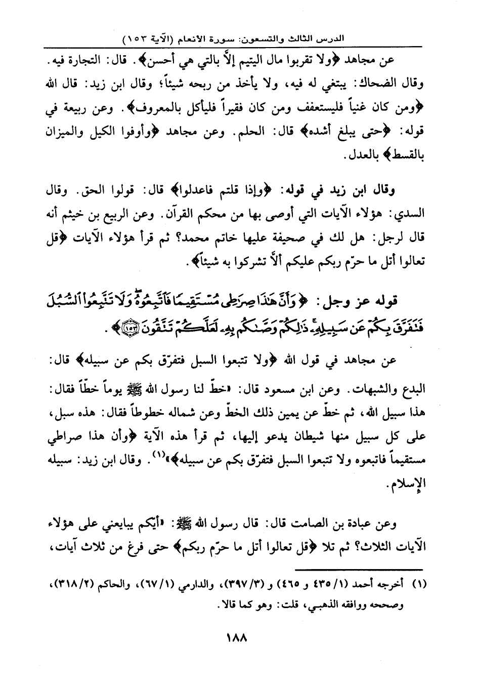 وعن عبادة بن الصامت قال: قال رسول الله: «أيّكم يبايعني على هؤلاء الآيات الثلاث» ؟ ثم تلا: {قُلْ تَعَالَوْاْ أَتْلُ مَا حَرَّمَ رَبُّكُمْ} حتى فرغ من ثلاث آيات،