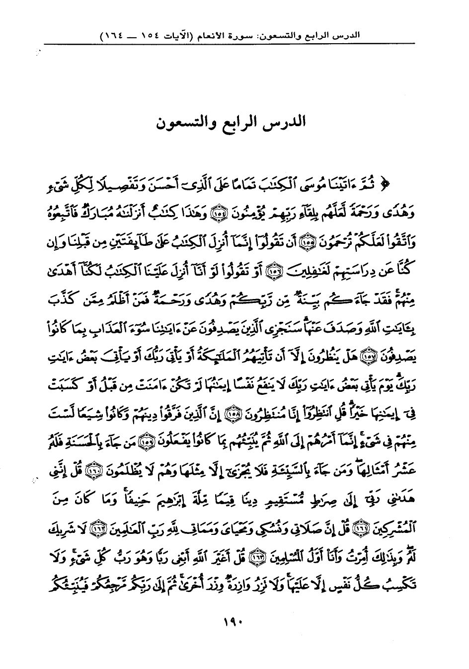 {ثُمَّ آتَيْنَا مُوسَى الْكِتَابَ تَمَاماً عَلَى الَّذِيَ أَحْسَنَ وَتَفْصِيلاً لِّكُلِّ شَيْءٍ وَهُدًى وَرَحْمَةً لَّعَلَّهُم بِلِقَاء رَبِّهِمْ يُؤْمِنُونَ (154) وَهَذَا كِتَابٌ أَنزَلْنَاهُ مُبَارَكٌ فَاتَّبِعُوهُ وَاتَّقُواْ لَعَلَّكُمْ تُرْحَمُونَ (155) أَن تَقُولُواْ إِنَّمَا أُنزِلَ الْكِتَابُ عَلَى طَآئِفَتَيْنِ مِن قَبْلِنَا وَإِن كُنَّا عَن دِرَاسَتِهِمْ لَغَافِلِينَ (156) أَوْ تَقُولُواْ لَوْ أَنَّا أُنزِلَ عَلَيْنَا الْكِتَابُ لَكُنَّا أَهْدَى مِنْهُمْ فَقَدْ جَاءكُم بَيِّنَةٌ مِّن رَّبِّكُمْ وَهُدًى وَرَحْمَةٌ فَمَنْ أَظْلَمُ مِمَّن كَذَّبَ بِآيَاتِ اللهِ وَصَدَفَ عَنْهَا سَنَجْزِي الَّذِينَ يَصْدِفُونَ عَنْ آيَاتِنَا سُوءَ الْعَذَابِ بِمَا كَانُواْ يَصْدِفُونَ (157) هَلْ يَنظُرُونَ إِلاَّ أَن تَأْتِيهُمُ الْمَلآئِكَةُ أَوْ يَأْتِيَ رَبُّكَ أَوْ يَأْتِيَ بَعْضُ آيَاتِ رَبِّكَ يَوْمَ يَأْتِي بَعْضُ آيَاتِ رَبِّكَ لاَ يَنفَعُ نَفْساً إِيمَانُهَا لَمْ تَكُنْ آمَنَتْ مِن قَبْلُ أَوْ كَسَبَتْ فِي إِيمَانِهَا خَيْراً قُلِ انتَظِرُواْ إِنَّا مُنتَظِرُونَ (158) إِنَّ الَّذِينَ فَرَّقُواْ دِينَهُمْ وَكَانُواْ شِيَعاً لَّسْتَ مِنْهُمْ فِي شَيْءٍ إِنَّمَا أَمْرُهُمْ إِلَى اللهِ ثُمَّ يُنَبِّئُهُم بِمَا كَانُواْ يَفْعَلُونَ (159) مَن جَاء بِالْحَسَنَةِ فَلَهُ عَشْرُ أَمْثَالِهَا وَمَن جَاء بِالسَّيِّئَةِ فَلاَ يُجْزَى إِلاَّ مِثْلَهَا وَهُمْ لاَ يُظْلَمُونَ (160) قُلْ إِنَّنِي هَدَانِي رَبِّي إِلَى صِرَاطٍ مُّسْتَقِيمٍ دِيناً قِيَماً مِّلَّةَ إِبْرَاهِيمَ حَنِيفاً وَمَا كَانَ مِنَ الْمُشْرِكِينَ (161) قُلْ إِنَّ صَلاَتِي وَنُسُكِي وَمَحْيَايَ وَمَمَاتِي لِلّهِ رَبِّ الْعَالَمِينَ (162) لاَ شَرِيكَ لَهُ وَبِذَلِكَ أُمِرْتُ وَأَنَاْ أَوَّلُ الْمُسْلِمِينَ (163) قُلْ أَغَيْرَ اللهِ أَبْغِي رَبّاً وَهُوَ رَبُّ كُلِّ شَيْءٍ وَلاَ تَكْسِبُ كُلُّ نَفْسٍ إِلاَّ عَلَيْهَا وَلاَ تَزِرُ وَازِرَةٌ وِزْرَ أُخْرَى ثُمَّ إِلَى