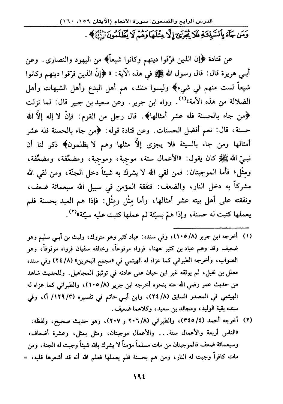 عن قتادة: {إِنَّ الَّذِينَ فَرَّقُواْ دِينَهُمْ وَكَانُواْ شِيَعاً} من اليهود والنصارى. وعن أبي هريرة قال: قال رسول الله - صلى الله عليه وسلم - في هذه الآية: {إِنَّ الَّذِينَ فَرَّقُواْ دِينَهُمْ وَكَانُواْ شِيَعاً لَّسْتَ مِنْهُمْ فِي شَيْءٍ} وليسوا منك: «هم أهل البدع، وأهل الشبهات، وأهل الضلالة من هذه الأمة» . رواه ابن جرير. وعن سعيد بن جبير قال: لما نزلت: {مَن جَاء بِالْحَسَنَةِ فَلَهُ عَشْرُ