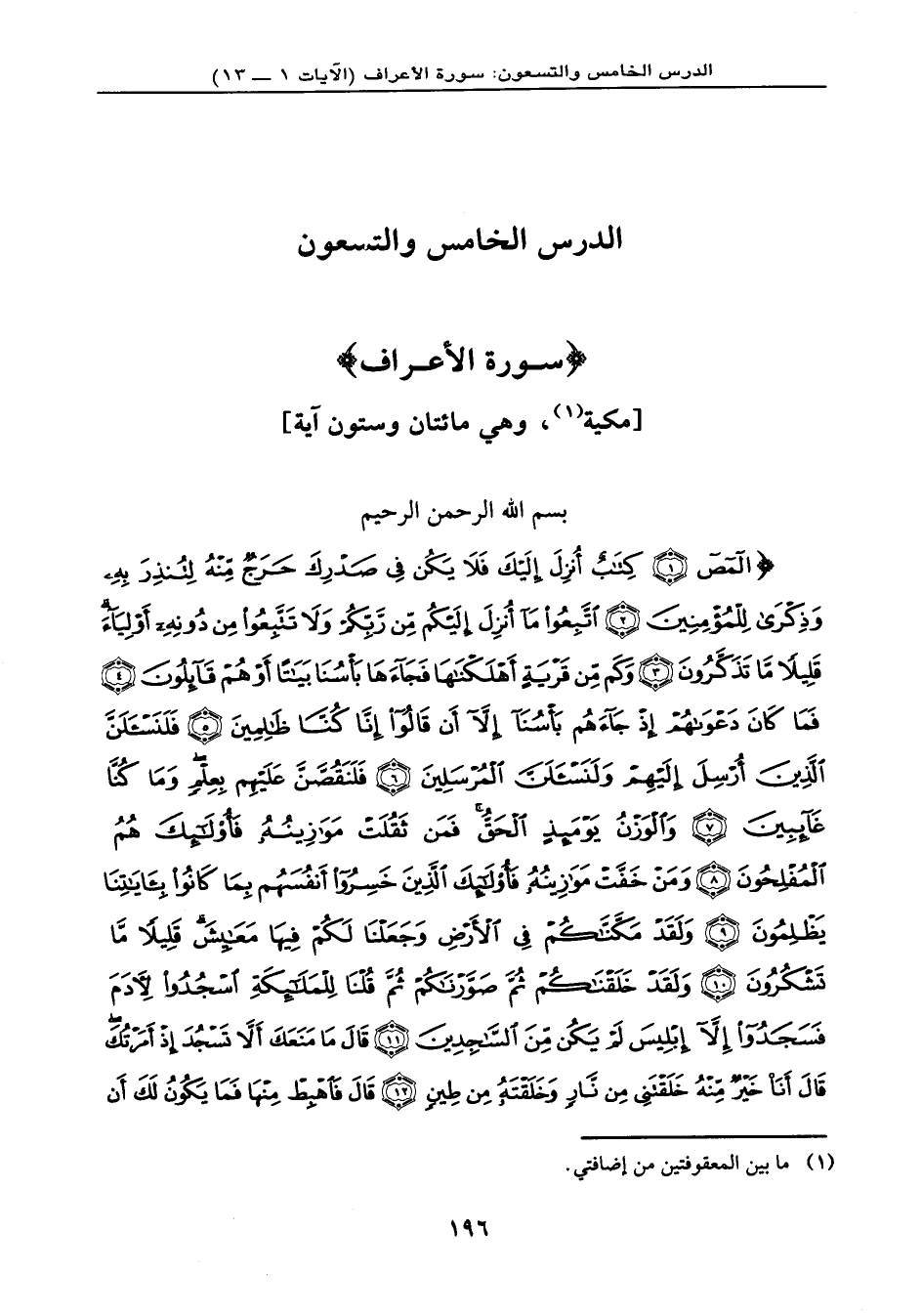{آلمص (1) كِتَابٌ أُنزِلَ إِلَيْكَ فَلاَ يَكُن فِي صَدْرِكَ حَرَجٌ مِّنْهُ لِتُنذِرَ بِهِ وَذِكْرَى لِلْمُؤْمِنِينَ (2) اتَّبِعُواْ مَا أُنزِلَ إِلَيْكُم مِّن رَّبِّكُمْ وَلاَ تَتَّبِعُواْ مِن دُونِهِ أَوْلِيَاء قَلِيلاً مَّا تَذَكَّرُونَ (3) وَكَم مِّن قَرْيَةٍ أَهْلَكْنَاهَا فَجَاءهَا بَأْسُنَا بَيَاتاً أَوْ هُمْ قَآئِلُونَ (4) فَمَا كَانَ دَعْوَاهُمْ إِذْ جَاءهُمْ بَأْسُنَا إِلاَّ أَن قَالُواْ إِنَّا كُنَّا ظَالِمِينَ (5) فَلَنَسْأَلَنَّ الَّذِينَ أُرْسِلَ إِلَيْهِمْ وَلَنَسْأَلَنَّ الْمُرْسَلِينَ (6) فَلَنَقُصَّنَّ عَلَيْهِم بِعِلْمٍ وَمَا كُنَّا غَآئِبِينَ (7) وَالْوَزْنُ يَوْمَئِذٍ الْحَقُّ فَمَن ثَقُلَتْ مَوَازِينُهُ فَأُوْلَئِكَ هُمُ الْمُفْلِحُونَ (8) وَمَنْ خَفَّتْ مَوَازِينُهُ فَأُوْلَئِكَ الَّذِينَ خَسِرُواْ أَنفُسَهُم بِمَا كَانُواْ بِآيَاتِنَا يِظْلِمُونَ (9) وَلَقَدْ مَكَّنَّاكُمْ فِي الأَرْضِ وَجَعَلْنَا لَكُمْ فِيهَا مَعَايِشَ قَلِيلاً مَّا تَشْكُرُونَ (10) وَلَقَدْ خَلَقْنَاكُمْ ثُمَّ صَوَّرْنَاكُمْ ثُمَّ قُلْنَا لِلْمَلآئِكَةِ اسْجُدُواْ لآدَمَ فَسَجَدُواْ إِلاَّ إِبْلِيسَ لَمْ يَكُن مِّنَ السَّاجِدِينَ (11) قَالَ مَا مَنَعَكَ أَلاَّ تَسْجُدَ إِذْ أَمَرْتُكَ قَالَ أَنَاْ خَيْرٌ مِّنْهُ خَلَقْتَنِي مِن نَّارٍ وَخَلَقْتَهُ مِن طِينٍ (12) قَالَ فَاهْبِطْ مِنْهَا فَمَا يَكُونُ لَكَ أَن