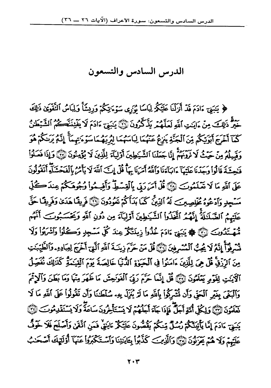 {يَا بَنِي آدَمَ قَدْ أَنزَلْنَا عَلَيْكُمْ لِبَاساً يُوَارِي سَوْءَاتِكُمْ وَرِيشاً وَلِبَاسُ التَّقْوَىَ ذَلِكَ خَيْرٌ ذَلِكَ مِنْ آيَاتِ اللهِ لَعَلَّهُمْ يَذَّكَّرُونَ (26) يَا بَنِي آدَمَ لاَ يَفْتِنَنَّكُمُ الشَّيْطَانُ كَمَا أَخْرَجَ أَبَوَيْكُم مِّنَ الْجَنَّةِ يَنزِعُ عَنْهُمَا لِبَاسَهُمَا لِيُرِيَهُمَا سَوْءَاتِهِمَا إِنَّهُ يَرَاكُمْ هُوَ وَقَبِيلُهُ مِنْ حَيْثُ لاَ تَرَوْنَهُمْ إِنَّا جَعَلْنَا الشَّيَاطِينَ أَوْلِيَاء لِلَّذِينَ لاَ يُؤْمِنُونَ (27) وَإِذَا فَعَلُواْ فَاحِشَةً قَالُواْ وَجَدْنَا عَلَيْهَا آبَاءنَا وَاللهُ أَمَرَنَا بِهَا قُلْ إِنَّ اللهَ لاَ يَأْمُرُ بِالْفَحْشَاء أَتَقُولُونَ عَلَى اللهِ مَا لاَ تَعْلَمُونَ (28) قُلْ أَمَرَ رَبِّي بِالْقِسْطِ وَأَقِيمُواْ وُجُوهَكُمْ عِندَ كُلِّ مَسْجِدٍ وَادْعُوهُ مُخْلِصِينَ لَهُ الدِّينَ كَمَا بَدَأَكُمْ تَعُودُونَ (29) فَرِيقاً هَدَى وَفَرِيقاً حَقَّ عَلَيْهِمُ الضَّلاَلَةُ إِنَّهُمُ اتَّخَذُوا الشَّيَاطِينَ أَوْلِيَاء مِن دُونِ اللهِ وَيَحْسَبُونَ أَنَّهُم مُّهْتَدُونَ (30) يَا بَنِي آدَمَ خُذُواْ زِينَتَكُمْ عِندَ كُلِّ مَسْجِدٍ وكُلُواْ وَاشْرَبُواْ وَلاَ تُسْرِفُواْ إِنَّهُ لاَ يُحِبُّ الْمُسْرِفِينَ (31) قُلْ مَنْ حَرَّمَ زِينَةَ اللهِ الَّتِيَ أَخْرَجَ لِعِبَادِهِ وَالْطَّيِّبَاتِ مِنَ الرِّزْقِ قُلْ هِي لِلَّذِينَ آمَنُواْ فِي الْحَيَاةِ الدُّنْيَا خَالِصَةً يَوْمَ الْقِيَامَةِ كَذَلِكَ نُفَصِّلُ الآيَاتِ لِقَوْمٍ يَعْلَمُونَ (32) قُلْ إِنَّمَا حَرَّمَ رَبِّيَ الْفَوَاحِشَ مَا ظَهَرَ مِنْهَا وَمَا بَطَنَ وَالإِثْمَ وَالْبَغْيَ بِغَيْرِ الْحَقِّ وَأَن تُشْرِكُواْ بِاللهِ مَا لَمْ يُنَزِّلْ بِهِ سُلْطَاناً وَأَن تَقُولُواْ عَلَى اللهِ مَا لاَ تَعْلَمُونَ (33) وَلِكُلِّ أُمَّةٍ أَجَلٌ فَإِذَا جَاء أَجَلُهُمْ لاَ يَسْتَأْخِرُونَ سَاعَةً وَلاَ يَسْتَقْدِمُونَ (34) يَا بَنِي آدَمَ إِمَّا يَأْتِيَنَّكُمْ رُسُلٌ مِّنكُمْ يَقُصُّونَ عَلَيْكُمْ آيَاتِي فَمَنِ اتَّقَى