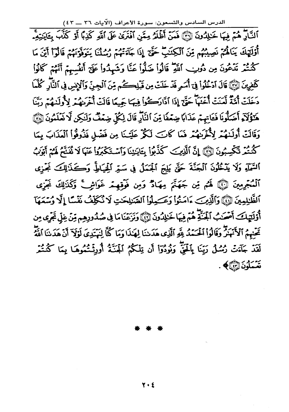 النَّارِ هُمْ فِيهَا خَالِدُونَ (36) فَمَنْ أَظْلَمُ مِمَّنِ افْتَرَى عَلَى اللهِ كَذِباً أَوْ كَذَّبَ بِآيَاتِهِ أُوْلَئِكَ يَنَالُهُمْ نَصِيبُهُم مِّنَ الْكِتَابِ حَتَّى إِذَا جَاءتْهُمْ رُسُلُنَا يَتَوَفَّوْنَهُمْ قَالُواْ أَيْنَ مَا كُنتُمْ تَدْعُونَ مِن دُونِ اللهِ قَالُواْ ضَلُّواْ عَنَّا وَشَهِدُواْ عَلَى أَنفُسِهِمْ أَنَّهُمْ كَانُواْ كَافِرِينَ (37) قَالَ ادْخُلُواْ فِي أُمَمٍ قَدْ خَلَتْ مِن قَبْلِكُم مِّن الْجِنِّ وَالإِنسِ فِي النَّارِ كُلَّمَا دَخَلَتْ أُمَّةٌ لَّعَنَتْ أُخْتَهَا حَتَّى إِذَا ادَّارَكُواْ فِيهَا جَمِيعاً قَالَتْ أُخْرَاهُمْ لأُولاَهُمْ رَبَّنَا هَؤُلاء أَضَلُّونَا فَآتِهِمْ عَذَاباً ضِعْفاً مِّنَ النَّارِ قَالَ لِكُلٍّ ضِعْفٌ وَلَكِن لاَّ تَعْلَمُونَ (38) وَقَالَتْ أُولاَهُمْ لأُخْرَاهُمْ فَمَا كَانَ لَكُمْ عَلَيْنَا مِن فَضْلٍ فَذُوقُواْ الْعَذَابَ بِمَا كُنتُمْ تَكْسِبُونَ (39) إِنَّ الَّذِينَ كَذَّبُواْ بِآيَاتِنَا وَاسْتَكْبَرُواْ عَنْهَا لاَ تُفَتَّحُ لَهُمْ أَبْوَابُ السَّمَاء وَلاَ يَدْخُلُونَ الْجَنَّةَ حَتَّى يَلِجَ الْجَمَلُ فِي سَمِّ الْخِيَاطِ وَكَذَلِكَ نَجْزِي الْمُجْرِمِينَ (40) لَهُم مِّن جَهَنَّمَ مِهَادٌ وَمِن فَوْقِهِمْ غَوَاشٍ وَكَذَلِكَ نَجْزِي الظَّالِمِينَ (41) وَالَّذِينَ آمَنُواْ وَعَمِلُواْ الصَّالِحَاتِ لاَ نُكَلِّفُ نَفْساً إِلاَّ وُسْعَهَا أُوْلَئِكَ أَصْحَابُ الْجَنَّةِ هُمْ فِيهَا خَالِدُونَ (42) وَنَزَعْنَا مَا فِي صُدُورِهِم مِّنْ غِلٍّ تَجْرِي مِن تَحْتِهِمُ الأَنْهَارُ وَقَالُواْ الْحَمْدُ لِلّهِ الَّذِي هَدَانَا لِهَذَا وَمَا كُنَّا لِنَهْتَدِيَ لَوْلا أَنْ هَدَانَا اللهُ لَقَدْ جَاءتْ رُسُلُ رَبِّنَا بِالْحَقِّ وَنُودُواْ أَن تِلْكُمُ الْجَنَّةُ أُورِثْتُمُوهَا بِمَا كُنتُمْ تَعْمَلُونَ (43) } .