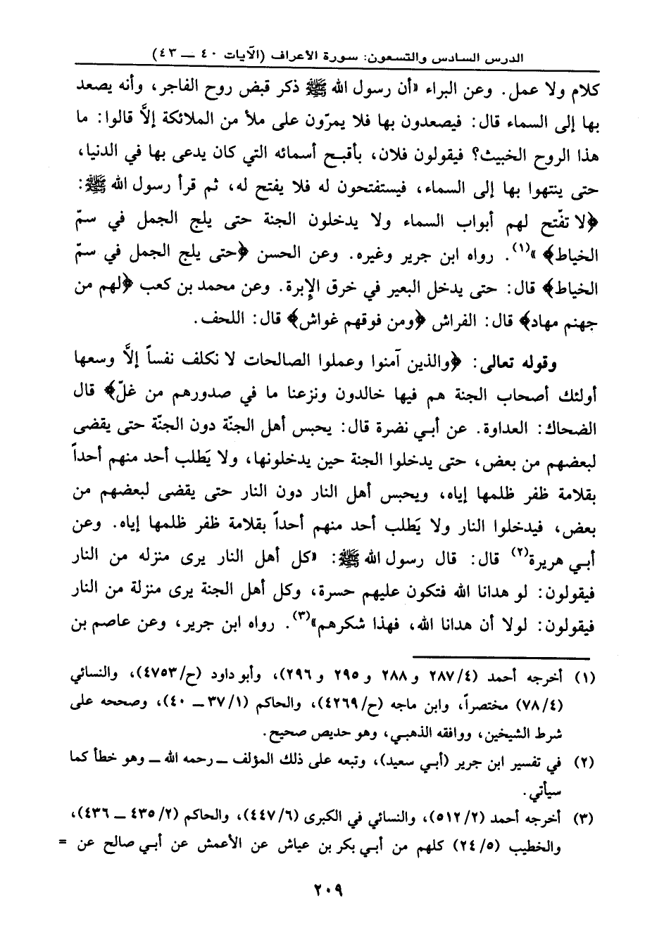 وقوله تعالى: {وَالَّذِينَ آمَنُواْ وَعَمِلُواْ الصَّالِحَاتِ لاَ نُكَلِّفُ نَفْساً إِلاَّ وُسْعَهَا أُوْلَئِكَ أَصْحَابُ الْجَنَّةِ هُمْ فِيهَا خَالِدُونَ * وَنَزَعْنَا مَا فِي صُدُورِهِم مِّنْ غِلٍّ} ، قال الضحاك: العداوة. عن أبي نضرة قال: يحبس أهل الجنّة دون الجنّة حتى يقضى لبعضهم من بعض، حتى يدخلوا الجنة حين يدخلونها، ولا يَطلب أحد منهم أحدًا بقلامة ظفر ظلمها إياه. ويحبس أهل النار دون النار حتى يقضى لبعضهم من بعض فيدخلوا النار، ولا يَطلب أحد منهم أحدًا بقلامة ظفر ظلمها إياه. وعن أبي هريرة قال: قال رسول الله - صلى الله عليه وسلم -: «كل أهل النار يرى منزله من النار فيقولون: لو هدانا الله فتكون عليهم حسرة. وكل أهل الجنة يرى منزلة من النار فيقولون: لولا أن هدانا الله، فهذا شكرهم» . رواه ابن جرير. وعن عاصم بن