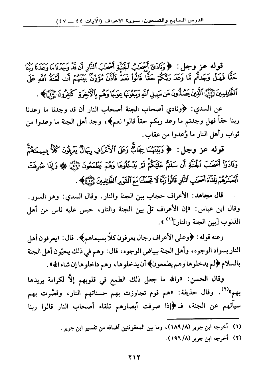 قال مجاهد: الأعراف: حجاب بين الجنة والنار. وقال السدي: وهو السور. وقال ابن عباس: (إن الأعراف تلّ بين الجنة والنار، حبس عليه ناس من أهل الذنوب [بين الجنة والنار] ) .