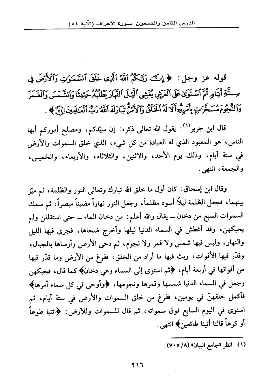 ثم استوى في اليوم السابع فوق سماواته، ثم قال للسماوات وللأرض: {اِئْتِيَا طَوْعاً أَوْ كَرْهاً قَالَتَا أَتَيْنَا طَائِعِينَ} . انتهى.