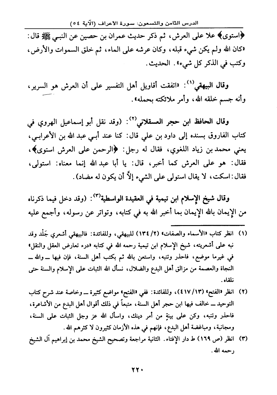 وقال الحافظ ابن حجر العسقلاني: (وقد نقل أبو إسماعيل الهروي في كتاب الفاروق بسنده إلى داود بن علي قال: كنا عند أبي عبد الله بن الأعرابي، يعني: محمد بن زياد اللغوي، فقال له رجل: {الرَّحْمَنُ عَلَى الْعَرْشِ اسْتَوَى} ، فقال: هو على العرش كما أخبر، قال: يا أبا عبد الله إنما معناه: استولى، فقال: اسكت، لا يقال استولى على الشيء إلا أن يكون له مضاد) .