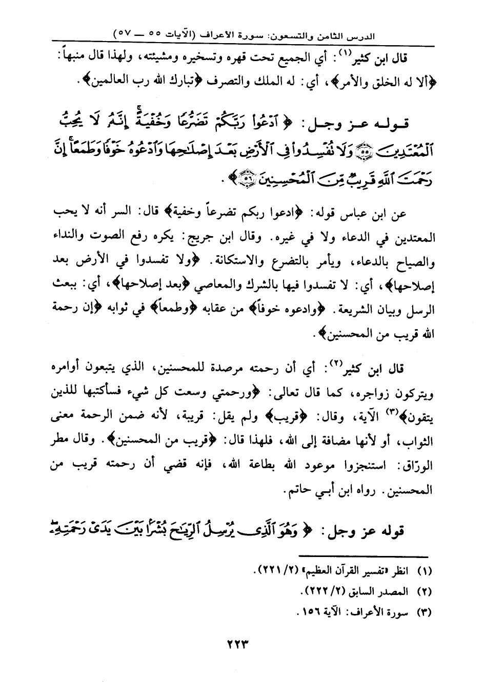 عن ابن عباس: قوله: {ادْعُواْ رَبَّكُمْ تَضَرُّعاً وَخُفْيَةً} ، قال: السر أنه لا يحب المعتدين في الدعاء ولا في غيره. وقال ابن جريج: يكره رفع الصوت والنداء والصياح بالدعاء، ويأمر بالتضرع والاستكانة. {وَلاَ تُفْسِدُواْ فِي الأَرْضِ بَعْدَ إِصْلاَحِهَا} ، أي: لا تفسدوا فيها بالشرك والمعاصي، {بَعْدَ إِصْلاَحِهَا} ، أي: يبعث الرسل وبيان الشريعة. ... {وَادْعُوهُ خَوْفاً} من عقابه، {وَطَمَعاً} في ثوابه، {إِنَّ رَحْمَتَ اللهِ قَرِيبٌ مِّنَ الْمُحْسِنِينَ} .