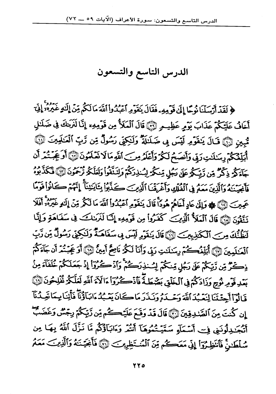 {لَقَدْ أَرْسَلْنَا نُوحاً إِلَى قَوْمِهِ فَقَالَ يَا قَوْمِ اعْبُدُواْ اللَّهَ مَا لَكُم مِّنْ إِلَهٍ غَيْرُهُ إِنِّيَ أَخَافُ عَلَيْكُمْ عَذَابَ يَوْمٍ عَظِيمٍ (59) قَالَ الْمَلأُ مِن قَوْمِهِ إِنَّا لَنَرَاكَ فِي ضَلاَلٍ مُّبِينٍ (60) قَالَ يَا قَوْمِ لَيْسَ بِي ضَلاَلَةٌ وَلَكِنِّي رَسُولٌ مِّن رَّبِّ الْعَالَمِينَ (61) أُبَلِّغُكُمْ رِسَالاَتِ رَبِّي وَأَنصَحُ لَكُمْ وَأَعْلَمُ مِنَ اللهِ مَا لاَ تَعْلَمُونَ (62) أَوَعَجِبْتُمْ أَن جَاءكُمْ ذِكْرٌ مِّن رَّبِّكُمْ عَلَى رَجُلٍ مِّنكُمْ لِيُنذِرَكُمْ وَلِتَتَّقُواْ وَلَعَلَّكُمْ تُرْحَمُونَ (63) فَكَذَّبُوهُ فَأَنجَيْنَاهُ وَالَّذِينَ مَعَهُ فِي الْفُلْكِ وَأَغْرَقْنَا الَّذِينَ كَذَّبُواْ بِآيَاتِنَا إِنَّهُمْ كَانُواْ قَوْماً عَمِينَ (64) وَإِلَى عَادٍ أَخَاهُمْ هُوداً قَالَ يَا قَوْمِ اعْبُدُواْ اللهَ مَا لَكُم مِّنْ إِلَهٍ غَيْرُهُ أَفَلاَ تَتَّقُونَ (65) قَالَ الْمَلأُ الَّذِينَ كَفَرُواْ مِن قَوْمِهِ إِنَّا لَنَرَاكَ فِي سَفَاهَةٍ وِإِنَّا لَنَظُنُّكَ مِنَ الْكَاذِبِينَ (66) قَالَ يَا قَوْمِ لَيْسَ بِي سَفَاهَةٌ وَلَكِنِّي رَسُولٌ مِّن رَّبِّ الْعَالَمِينَ (67) أُبَلِّغُكُمْ رِسَالاتِ رَبِّي وَأَنَاْ لَكُمْ نَاصِحٌ أَمِينٌ (68) أَوَعَجِبْتُمْ أَن جَاءكُمْ ذِكْرٌ مِّن رَّبِّكُمْ عَلَى رَجُلٍ مِّنكُمْ لِيُنذِرَكُمْ وَاذكُرُواْ إِذْ جَعَلَكُمْ خُلَفَاء مِن بَعْدِ قَوْمِ نُوحٍ وَزَادَكُمْ فِي الْخَلْقِ بَسْطَةً فَاذْكُرُواْ آلاء اللهِ لَعَلَّكُمْ تُفْلِحُونَ (69) قَالُواْ أَجِئْتَنَا لِنَعْبُدَ اللهَ وَحْدَهُ وَنَذَرَ مَا كَانَ يَعْبُدُ آبَاؤُنَا فَأْتِنَا بِمَا تَعِدُنَا إِن كُنتَ مِنَ الصَّادِقِينَ (70) قَالَ قَدْ وَقَعَ عَلَيْكُم مِّن رَّبِّكُمْ رِجْسٌ وَغَضَبٌ أَتُجَادِلُونَنِي فِي أَسْمَاء سَمَّيْتُمُوهَا أَنتُمْ وَآبَآؤكُم مَّا نَزَّلَ اللهُ بِهَا مِن سُلْطَانٍ فَانتَظِرُواْ إِنِّي مَعَكُم مِّنَ الْمُنتَظِرِينَ (71) فَأَنجَيْنَاهُ