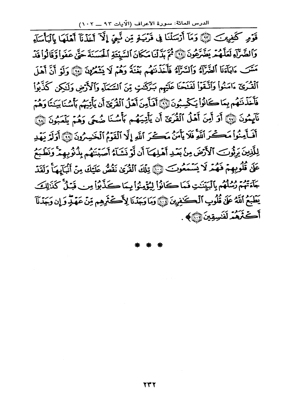 بِالْبَأْسَاء وَالضَّرَّاء لَعَلَّهُمْ يَضَّرَّعُونَ (94) ثُمَّ بَدَّلْنَا مَكَانَ السَّيِّئَةِ الْحَسَنَةَ حَتَّى عَفَواْ وَّقَالُواْ قَدْ مَسَّ آبَاءنَا الضَّرَّاء وَالسَّرَّاء فَأَخَذْنَاهُم بَغْتَةً وَهُمْ لاَ يَشْعُرُونَ (95) وَلَوْ أَنَّ أَهْلَ الْقُرَى آمَنُواْ وَاتَّقَواْ لَفَتَحْنَا عَلَيْهِم بَرَكَاتٍ مِّنَ السَّمَاءِ وَالأَرْضِ وَلَكِن كَذَّبُواْ فَأَخَذْنَاهُم بِمَا كَانُواْ يَكْسِبُونَ (96) أَفَأَمِنَ أَهْلُ الْقُرَى أَن يَأْتِيَهُمْ بَأْسُنَا بَيَاتاً وَهُمْ نَآئِمُونَ (97) أَوَ أَمِنَ أَهْلُ الْقُرَى أَن يَأْتِيَهُمْ بَأْسُنَا ضُحًى وَهُمْ يَلْعَبُونَ (98) أَفَأَمِنُواْ مَكْرَ اللهِ فَلاَ يَأْمَنُ مَكْرَ اللهِ إِلاَّ الْقَوْمُ الْخَاسِرُونَ (99) أَوَلَمْ يَهْدِ لِلَّذِينَ يَرِثُونَ الأَرْضَ مِن بَعْدِ أَهْلِهَا أَن لَّوْ نَشَاء أَصَبْنَاهُم بِذُنُوبِهِمْ وَنَطْبَعُ عَلَى قُلُوبِهِمْ فَهُمْ لاَ يَسْمَعُونَ (100) تِلْكَ الْقُرَى نَقُصُّ عَلَيْكَ مِنْ أَنبَآئِهَا وَلَقَدْ جَاءتْهُمْ رُسُلُهُم بِالْبَيِّنَاتِ فَمَا كَانُواْ لِيُؤْمِنُواْ بِمَا كَذَّبُواْ مِن قَبْلُ كَذَلِكَ يَطْبَعُ اللهُ عَلَىَ قُلُوبِ الْكَافِرِينَ (101) وَمَا وَجَدْنَا لأَكْثَرِهِم مِّنْ عَهْدٍ وَإِن وَجَدْنَا أَكْثَرَهُمْ لَفَاسِقِينَ (102) } .