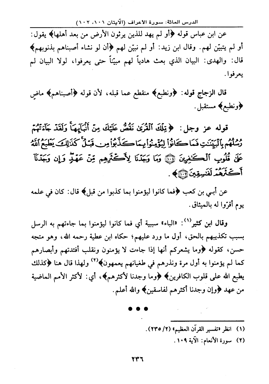 قوله عز وجل: {تِلْكَ الْقُرَى نَقُصُّ عَلَيْكَ مِنْ أَنبَآئِهَا وَلَقَدْ جَاءتْهُمْ رُسُلُهُم بِالْبَيِّنَاتِ فَمَا كَانُواْ لِيُؤْمِنُواْ بِمَا كَذَّبُواْ مِن قَبْلُ كَذَلِكَ يَطْبَعُ اللهُ عَلَىَ قُلُوبِ الْكَافِرِينَ (101) وَمَا وَجَدْنَا لأَكْثَرِهِم مِّنْ عَهْدٍ وَإِن وَجَدْنَا أَكْثَرَهُمْ لَفَاسِقِينَ (102) } .