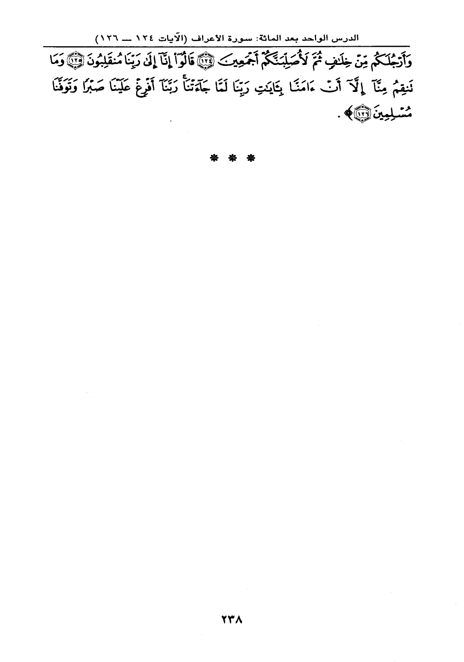 وَأَرْجُلَكُم مِّنْ خِلاَفٍ ثُمَّ لأُصَلِّبَنَّكُمْ أَجْمَعِينَ (124) قَالُواْ إِنَّا إِلَى رَبِّنَا مُنقَلِبُونَ (125) وَمَا تَنقِمُ مِنَّا إِلاَّ أَنْ آمَنَّا بِآيَاتِ رَبِّنَا لَمَّا جَاءتْنَا رَبَّنَا أَفْرِغْ عَلَيْنَا صَبْراً وَتَوَفَّنَا مُسْلِمِينَ (126) } .