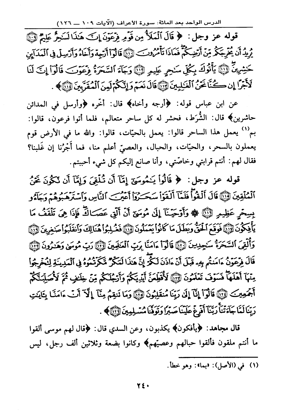 قوله عز وجل: {قَالَ الْمَلأُ مِن قَوْمِ فِرْعَوْنَ إِنَّ هَذَا لَسَاحِرٌ عَلِيمٌ (109) يُرِيدُ أَن يُخْرِجَكُم مِّنْ أَرْضِكُمْ فَمَاذَا تَأْمُرُونَ (110) قَالُواْ أَرْجِهْ وَأَخَاهُ وَأَرْسِلْ فِي الْمَدَآئِنِ حَاشِرِينَ (111) يَأْتُوكَ بِكُلِّ سَاحِرٍ عَلِيمٍ (112) وَجَاء السَّحَرَةُ فِرْعَوْنَ قَالْواْ إِنَّ لَنَا لأَجْراً إِن كُنَّا نَحْنُ الْغَالِبِينَ (113) قَالَ نَعَمْ وَإَنَّكُمْ لَمِنَ الْمُقَرَّبِينَ (114) } .