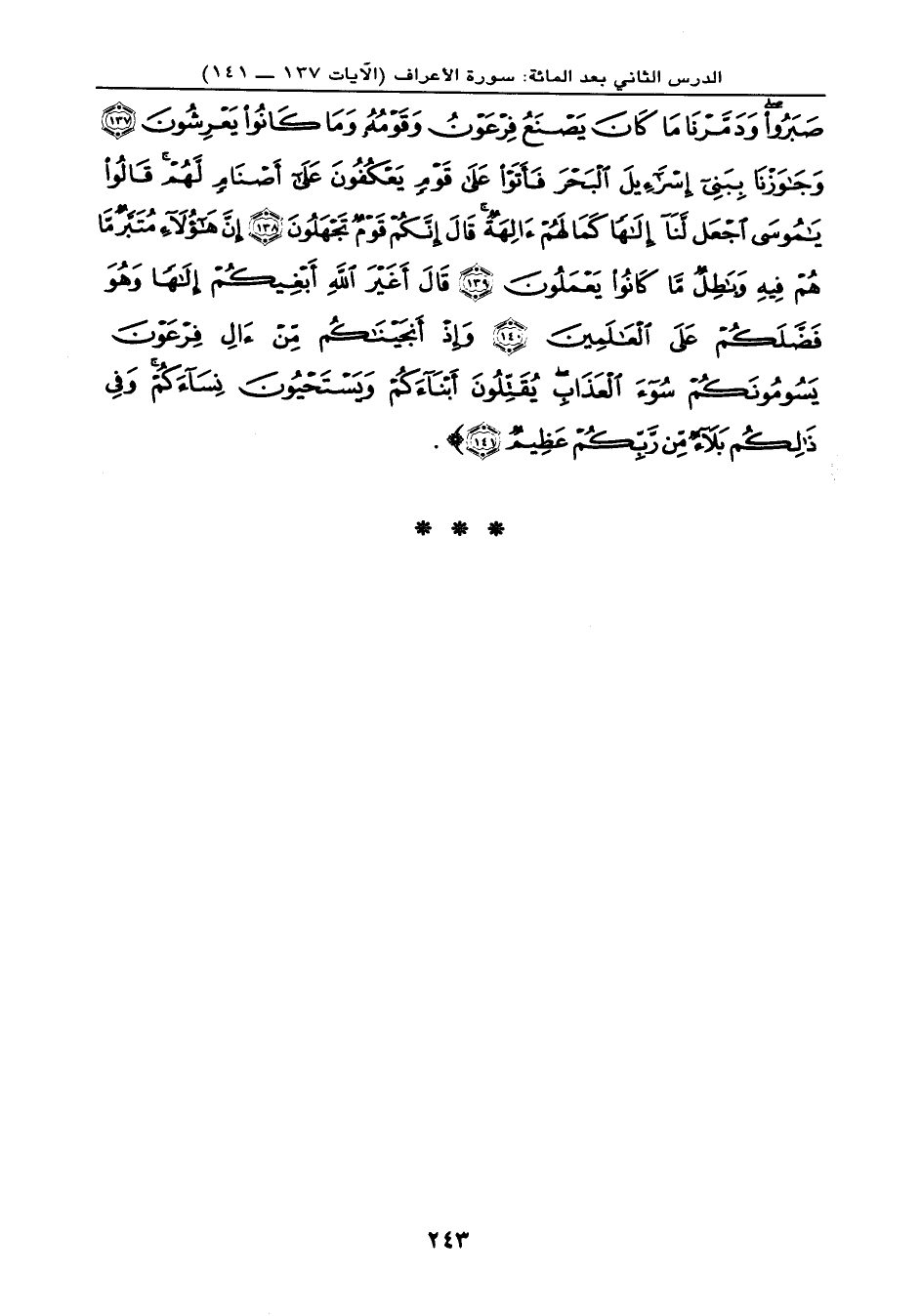 صَبَرُواْ وَدَمَّرْنَا مَا كَانَ يَصْنَعُ فِرْعَوْنُ وَقَوْمُهُ وَمَا كَانُواْ يَعْرِشُونَ (137) وَجَاوَزْنَا بِبَنِي إِسْرَائِيلَ الْبَحْرَ فَأَتَوْاْ عَلَى قَوْمٍ يَعْكُفُونَ عَلَى أَصْنَامٍ لَّهُمْ قَالُواْ يَا مُوسَى اجْعَل لَّنَا إِلَهاً كَمَا لَهُمْ آلِهَةٌ قَالَ إِنَّكُمْ قَوْمٌ تَجْهَلُونَ (138) إِنَّ هَؤُلاء مُتَبَّرٌ مَّا هُمْ فِيهِ وَبَاطِلٌ مَّا كَانُواْ يَعْمَلُونَ (139) قَالَ أَغَيْرَ اللهِ أَبْغِيكُمْ إِلَهاً وَهُوَ فَضَّلَكُمْ عَلَى الْعَالَمِينَ (140) وَإِذْ أَنجَيْنَاكُم مِّنْ آلِ فِرْعَونَ يَسُومُونَكُمْ سُوَءَ الْعَذَابِ يُقَتِّلُونَ أَبْنَاءكُمْ وَيَسْتَحْيُونَ نِسَاءكُمْ وَفِي ذَلِكُم بَلاء مِّن رَّبِّكُمْ عَظِيمٌ (141) } .