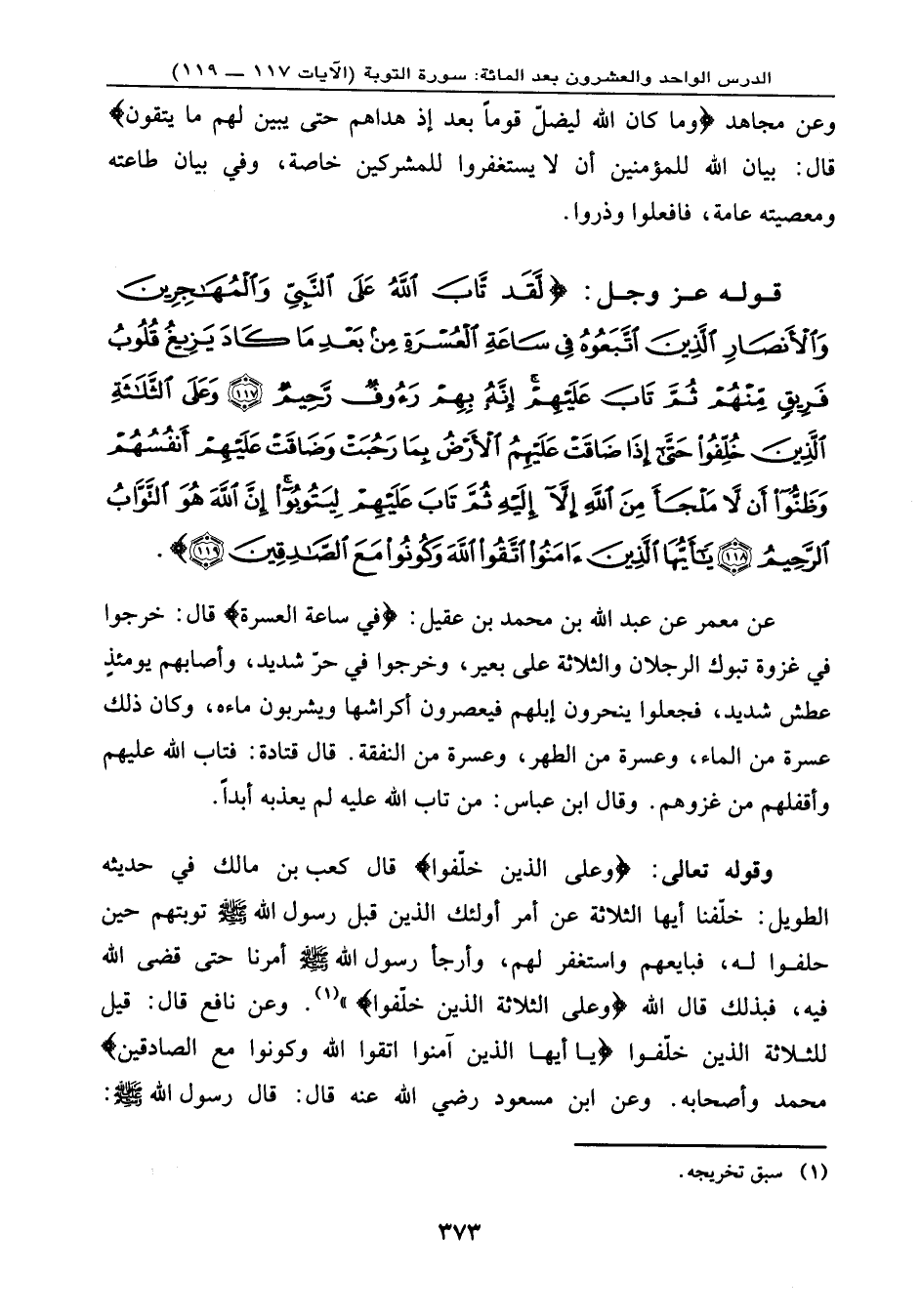 عن معمر عن عبد الله بن محمد بن عقيل: {فِي سَاعَةِ الْعُسْرَةِ} قال: خرجوا في غزوة تبوك الرجلان والثلاثة على بعير، وخرجوا في حرٍّ شديد، وأصابهم يومئذٍ عطش شديد، فجعلوا ينحرون إبلهم فيعصرون أكراشها ويشربون ماءه، وكان ذلك عسرة من الماء، وعسرة من الطهر، وعسرة من النفقة. قال قتادة: فتاب الله عليهم وأقفلهم من غزوهم. وقال ابن عباس: من تاب الله عليه لم يعذبه أبدًا.