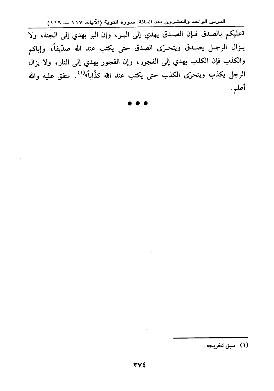 «عليكم بالصدق فإن الصدق يهدي إلى البر، وإن البر يهدي إلى الجنة، ولا يزال الرجل يصدق ويتحرّى الصدق حتى يكتب عند الله صدّيقًا، وإياكم والكذب فإن الكذب يهدي إلى الفجور، وإن الفجور يهدي إلى النار، ولا يزال الرجل يكذب ويتحرّى الكذب حتى يكتب عند الله كذّابًا» . متفق عليه. والله أعلم.