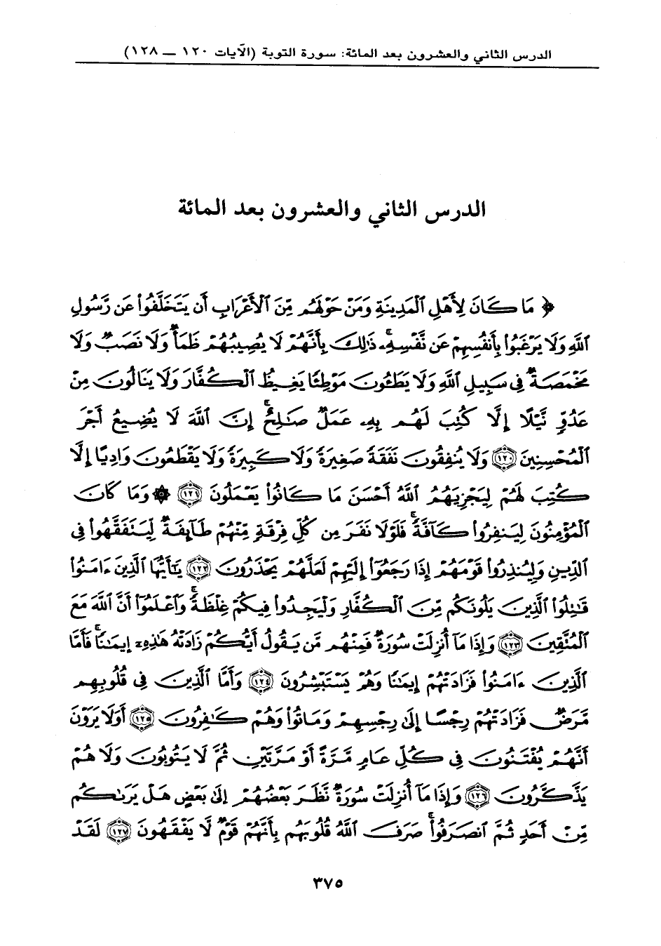 {مَا كَانَ لِأَهْلِ الْمَدِينَةِ وَمَنْ حَوْلَهُم مِّنَ الأَعْرَابِ أَن يَتَخَلَّفُواْ عَن رَّسُولِ اللهِ وَلاَ يَرْغَبُواْ بِأَنفُسِهِمْ عَن نَّفْسِهِ ذَلِكَ بِأَنَّهُمْ لاَ يُصِيبُهُمْ ظَمَأٌ وَلاَ نَصَبٌ وَلاَ مَخْمَصَةٌ فِي سَبِيلِ اللهِ وَلاَ يَطَؤُونَ مَوْطِئاً يَغِيظُ الْكُفَّارَ وَلاَ يَنَالُونَ مِنْ عَدُوٍّ نَّيْلاً إِلاَّ كُتِبَ لَهُم بِهِ عَمَلٌ صَالِحٌ إِنَّ اللهَ لاَ يُضِيعُ أَجْرَ الْمُحْسِنِينَ (120) وَلاَ يُنفِقُونَ نَفَقَةً صَغِيرَةً وَلاَ كَبِيرَةً وَلاَ يَقْطَعُونَ وَادِياً إِلاَّ كُتِبَ لَهُمْ لِيَجْزِيَهُمُ اللهُ أَحْسَنَ مَا كَانُواْ يَعْمَلُونَ (121) وَمَا كَانَ الْمُؤْمِنُونَ لِيَنفِرُواْ كَآفَّةً فَلَوْلاَ نَفَرَ مِن كُلِّ فِرْقَةٍ مِّنْهُمْ طَآئِفَةٌ لِّيَتَفَقَّهُواْ فِي الدِّينِ وَلِيُنذِرُواْ قَوْمَهُمْ إِذَا رَجَعُواْ إِلَيْهِمْ لَعَلَّهُمْ يَحْذَرُونَ (122) يَا أَيُّهَا الَّذِينَ آمَنُواْ قَاتِلُواْ الَّذِينَ يَلُونَكُم مِّنَ الْكُفَّارِ وَلْيَجِدُواْ فِيكُمْ غِلْظَةً وَاعْلَمُواْ أَنَّ اللهَ مَعَ الْمُتَّقِينَ (123) وَإِذَا مَا أُنزِلَتْ سُورَةٌ فَمِنْهُم مَّن يَقُولُ أَيُّكُمْ زَادَتْهُ هَذِهِ إِيمَاناً فَأَمَّا الَّذِينَ آمَنُواْ فَزَادَتْهُمْ إِيمَاناً وَهُمْ يَسْتَبْشِرُونَ (124) وَأَمَّا الَّذِينَ فِي قُلُوبِهِم مَّرَضٌ فَزَادَتْهُمْ رِجْساً إِلَى رِجْسِهِمْ وَمَاتُواْ وَهُمْ كَافِرُونَ (125) أَوَلاَ يَرَوْنَ أَنَّهُمْ يُفْتَنُونَ فِي كُلِّ عَامٍ مَّرَّةً أَوْ مَرَّتَيْنِ ثُمَّ لاَ يَتُوبُونَ وَلاَ هُمْ يَذَّكَّرُونَ (126) وَإِذَا مَا أُنزِلَتْ سُورَةٌ نَّظَرَ بَعْضُهُمْ إِلَى بَعْضٍ هَلْ يَرَاكُم مِّنْ أَحَدٍ ثُمَّ انصَرَفُواْ صَرَفَ اللهُ قُلُوبَهُم بِأَنَّهُمْ قَوْمٌ لاَّ يَفْقَهُون (127) لَقَدْ