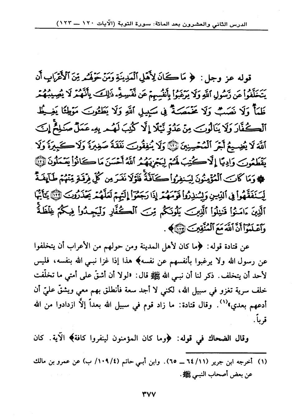 عن قتادة: قوله: {مَا كَانَ لِأَهْلِ الْمَدِينَةِ وَمَنْ حَوْلَهُم مِّنَ الأَعْرَابِ أَن يَتَخَلَّفُواْ عَن رَّسُولِ اللهِ وَلاَ يَرْغَبُواْ بِأَنفُسِهِمْ عَن نَّفْسِهِ} هذا إذا غزا نبي الله بنفسه، فليس لأحد أن يتخلف. ذكر لنا أن نبي الله - صلى الله عليه وسلم - قال: «لولا أن أشقّ على أمتي ما تخلّفت خلف سرية تغزو في سبيل الله، لكني لا أجد سعة فأنطلق بهم معي ويشقّ عليّ أن أدعهم بعدي» . وقال قتادة: ما زاد قوم في سبيل الله بعدًا إلا ازدادوا من الله قربًا.