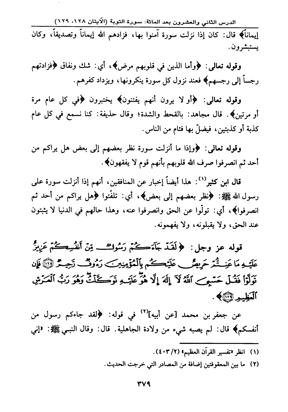 قوله عز وجل: {لَقَدْ جَاءكُمْ رَسُولٌ مِّنْ أَنفُسِكُمْ عَزِيزٌ عَلَيْهِ مَا عَنِتُّمْ حَرِيصٌ عَلَيْكُم بِالْمُؤْمِنِينَ رَؤُوفٌ رَّحِيمٌ (128) فَإِن تَوَلَّوْاْ فَقُلْ حَسْبِيَ اللهُ لا إِلَهَ إِلاَّ هُوَ عَلَيْهِ تَوَكَّلْتُ وَهُوَ رَبُّ الْعَرْشِ الْعَظِيمِ (129) } .
