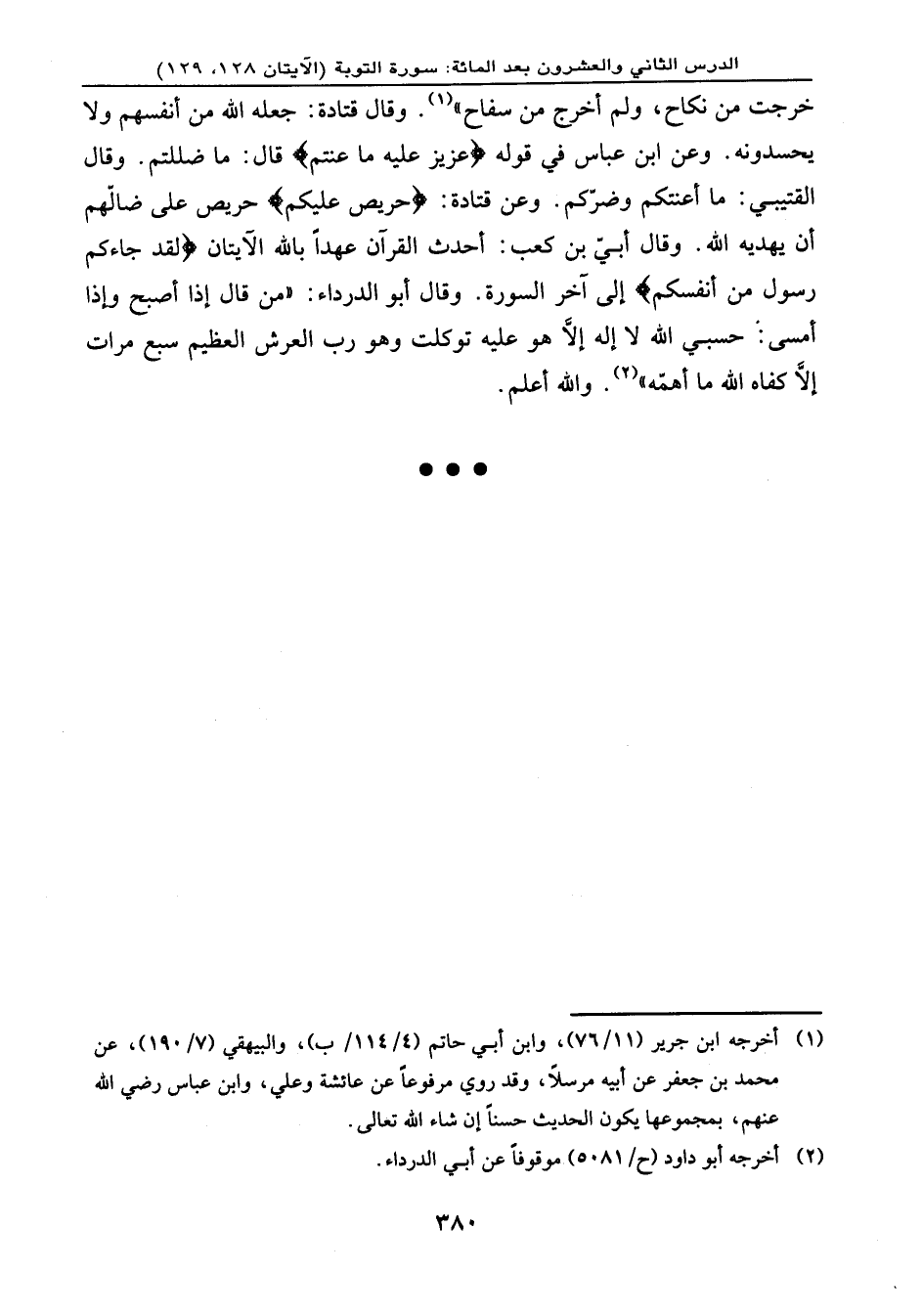 خرجت من نكاح، ولم أخرج من سفاح» . وقال قتادة: جعله الله من أنفسهم ولا يحسدونه. وعن ابن عباس في قوله: {عَزِيزٌ عَلَيْهِ مَا عَنِتُّمْ} قال: ما ضللتم. وقال القتيبي: ما أعنتكم وضرّكم. وعن قتادة: {حَرِيصٌ عَلَيْكُم} حريص على ضالّهم أن يهديه الله. وقال أبيّ بن كعب: أحدث القرآن عهدًا بالله الآيتان، {لَقَدْ جَاءكُمْ رَسُولٌ مِّنْ أَنفُسِكُمْ} إلى آخر السورة. وقال أبو الدرداء: (من قال إذا أصبح وإذا أمسى: حسبي الله لا إله إلا هو عليه توكلت وهو رب العرش العظيم سبع مرات إلا كفاه الله ما أهمّه) . والله أعلم.