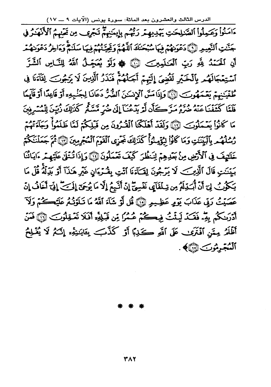 جَنَّاتِ النَّعِيمِ (9) دَعْوَاهُمْ فِيهَا سُبْحَانَكَ اللَّهُمَّ وَتَحِيَّتُهُمْ فِيهَا سَلاَمٌ وَآخِرُ دَعْوَاهُمْ أَنِ الْحَمْدُ لِلّهِ رَبِّ الْعَالَمِينَ (10) وَلَوْ يُعَجِّلُ اللهُ لِلنَّاسِ الشَّرَّ اسْتِعْجَالَهُم بِالْخَيْرِ لَقُضِيَ إِلَيْهِمْ أَجَلُهُمْ فَنَذَرُ الَّذِينَ لاَ يَرْجُونَ لِقَاءنَا فِي طُغْيَانِهِمْ يَعْمَهُونَ (11) وَإِذَا مَسَّ الإِنسَانَ الضُّرُّ دَعَانَا لِجَنبِهِ أَوْ قَاعِداً أَوْ قَآئِماً فَلَمَّا كَشَفْنَا عَنْهُ ضُرَّهُ مَرَّ كَأَن لَّمْ يَدْعُنَا إِلَى ضُرٍّ مَّسَّهُ كَذَلِكَ زُيِّنَ لِلْمُسْرِفِينَ مَا كَانُواْ يَعْمَلُونَ (12) وَلَقَدْ أَهْلَكْنَا الْقُرُونَ مِن قَبْلِكُمْ لَمَّا ظَلَمُواْ وَجَاءتْهُمْ رُسُلُهُم بِالْبَيِّنَاتِ وَمَا كَانُواْ لِيُؤْمِنُواْ كَذَلِكَ نَجْزِي الْقَوْمَ الْمُجْرِمِينَ (13) ثُمَّ جَعَلْنَاكُمْ خَلاَئِفَ فِي الأَرْضِ مِن بَعْدِهِم لِنَنظُرَ كَيْفَ تَعْمَلُونَ (14) وَإِذَا تُتْلَى عَلَيْهِمْ آيَاتُنَا بَيِّنَاتٍ قَالَ الَّذِينَ لاَ يَرْجُونَ لِقَاءنَا ائْتِ بِقُرْآنٍ غَيْرِ هَذَا أَوْ بَدِّلْهُ قُلْ مَا يَكُونُ لِي أَنْ أُبَدِّلَهُ مِن تِلْقَاء نَفْسِي إِنْ أَتَّبِعُ إِلاَّ مَا يُوحَى إِلَيَّ إِنِّي أَخَافُ إِنْ عَصَيْتُ رَبِّي عَذَابَ يَوْمٍ عَظِيمٍ (15) قُل لَّوْ شَاء اللهُ مَا تَلَوْتُهُ عَلَيْكُمْ وَلاَ أَدْرَاكُم بِهِ فَقَدْ لَبِثْتُ فِيكُمْ عُمُراً مِّن قَبْلِهِ أَفَلاَ تَعْقِلُونَ (16) فَمَنْ أَظْلَمُ مِمَّنِ افْتَرَى عَلَى اللهِ كَذِباً أَوْ كَذَّبَ بِآيَاتِهِ إِنَّهُ لاَ يُفْلِحُ الْمُجْرِمُونَ (17) } .