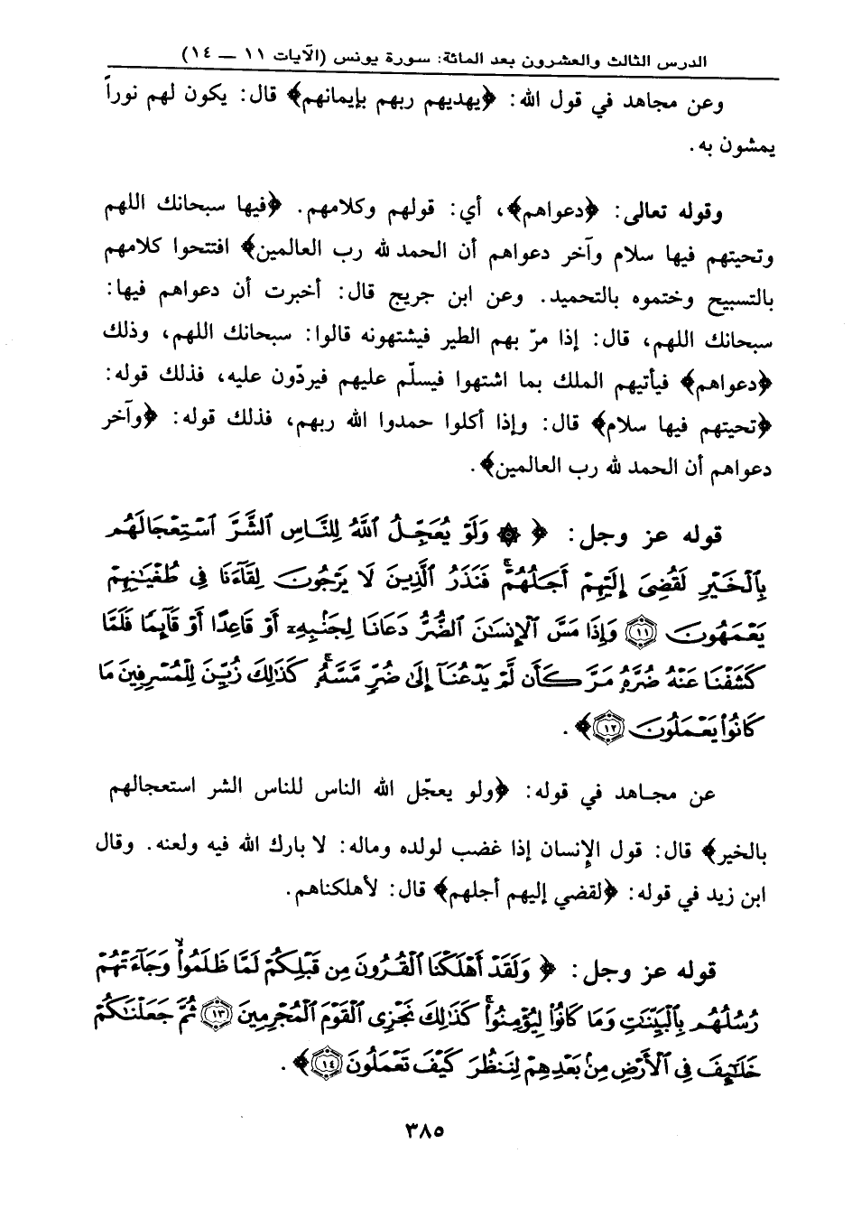 عن مجاهد في قوله: {وَلَوْ يُعَجِّلُ اللهُ لِلنَّاسِ الشَّرَّ اسْتِعْجَالَهُم بِالْخَيْرِ} قال: قول الإنسان إذا غضب لولده وماله، لا بارك الله فيه ولعنه. وقال ابن زيد في قوله: {لَقُضِيَ إِلَيْهِمْ أَجَلُهُمْ} ، قال لأهلكناهم.
