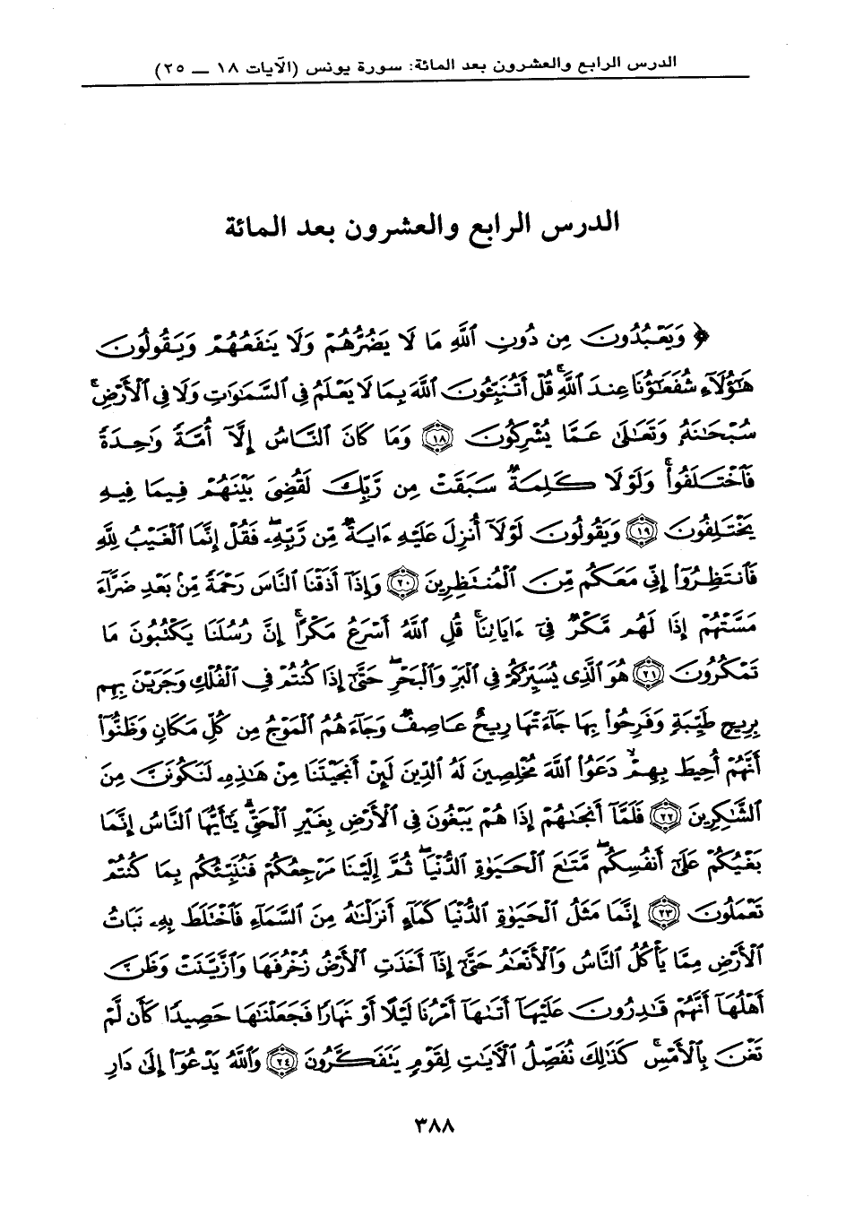 {وَيَعْبُدُونَ مِن دُونِ اللهِ مَا لاَ يَضُرُّهُمْ وَلاَ يَنفَعُهُمْ وَيَقُولُونَ هَؤُلاء شُفَعَاؤُنَا عِندَ اللهِ قُلْ أَتُنَبِّئُونَ اللهَ بِمَا لاَ يَعْلَمُ فِي السَّمَاوَاتِ وَلاَ فِي الأَرْضِ سُبْحَانَهُ وَتَعَالَى عَمَّا يُشْرِكُونَ (18) وَمَا كَانَ النَّاسُ إِلاَّ أُمَّةً وَاحِدَةً فَاخْتَلَفُواْ وَلَوْلاَ كَلِمَةٌ سَبَقَتْ مِن رَّبِّكَ لَقُضِيَ بَيْنَهُمْ فِيمَا فِيهِ يَخْتَلِفُونَ (19) وَيَقُولُونَ لَوْلاَ أُنزِلَ عَلَيْهِ آيَةٌ مِّن رَّبِّهِ فَقُلْ إِنَّمَا الْغَيْبُ لِلّهِ فَانْتَظِرُواْ إِنِّي مَعَكُم مِّنَ الْمُنتَظِرِينَ (20) وَإِذَا أَذَقْنَا النَّاسَ رَحْمَةً مِّن بَعْدِ ضَرَّاء مَسَّتْهُمْ إِذَا لَهُم مَّكْرٌ فِي آيَاتِنَا قُلِ اللهُ أَسْرَعُ مَكْراً إِنَّ رُسُلَنَا يَكْتُبُونَ مَا تَمْكُرُونَ (21) هُوَ الَّذِي يُسَيِّرُكُمْ فِي الْبَرِّ وَالْبَحْرِ حَتَّى إِذَا كُنتُمْ فِي الْفُلْكِ وَجَرَيْنَ بِهِم بِرِيحٍ طَيِّبَةٍ وَفَرِحُواْ بِهَا جَاءتْهَا رِيحٌ عَاصِفٌ وَجَاءهُمُ الْمَوْجُ مِن كُلِّ مَكَانٍ وَظَنُّواْ أَنَّهُمْ أُحِيطَ بِهِمْ دَعَوُاْ اللهَ مُخْلِصِينَ لَهُ الدِّينَ لَئِنْ أَنجَيْتَنَا مِنْ هَذِهِ لَنَكُونَنِّ مِنَ الشَّاكِرِينَ (22) فَلَمَّا أَنجَاهُمْ إِذَا هُمْ يَبْغُونَ فِي الأَرْضِ بِغَيْرِ الْحَقِّ يَا أَيُّهَا النَّاسُ إِنَّمَا بَغْيُكُمْ عَلَى أَنفُسِكُم مَّتَاعَ الْحَيَاةِ الدُّنْيَا ثُمَّ إِلَينَا مَرْجِعُكُمْ فَنُنَبِّئُكُم بِمَا كُنتُمْ تَعْمَلُونَ (23) إِنَّمَا مَثَلُ الْحَيَاةِ الدُّنْيَا كَمَاء أَنزَلْنَاهُ مِنَ السَّمَاءِ فَاخْتَلَطَ بِهِ نَبَاتُ الأَرْضِ مِمَّا يَأْكُلُ النَّاسُ وَالأَنْعَامُ حَتَّىَ إِذَا أَخَذَتِ الأَرْضُ زُخْرُفَهَا وَازَّيَّنَتْ وَظَنَّ أَهْلُهَا أَنَّهُمْ قَادِرُونَ عَلَيْهَا أَتَاهَا أَمْرُنَا لَيْلاً أَوْ نَهَاراً فَجَعَلْنَاهَا حَصِيداً كَأَن لَّمْ تَغْنَ بِالأَمْسِ كَذَلِكَ نُفَصِّلُ الآيَاتِ لِقَوْمٍ يَتَفَكَّرُونَ (24) وَاللهُ يَدْعُو إِلَى دَارِ