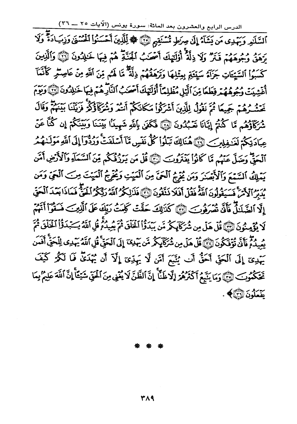 السَّلاَمِ وَيَهْدِي مَن يَشَاءُ إِلَى صِرَاطٍ مُّسْتَقِيمٍ (25) لِّلَّذِينَ أَحْسَنُواْ الْحُسْنَى وَزِيَادَةٌ وَلاَ يَرْهَقُ وُجُوهَهُمْ قَتَرٌ وَلاَ ذِلَّةٌ أُوْلَئِكَ أَصْحَابُ الْجَنَّةِ هُمْ فِيهَا خَالِدُونَ (26) وَالَّذِينَ كَسَبُواْ السَّيِّئَاتِ جَزَاء سَيِّئَةٍ بِمِثْلِهَا وَتَرْهَقُهُمْ ذِلَّةٌ مَّا لَهُم مِّنَ اللهِ مِنْ عَاصِمٍ كَأَنَّمَا أُغْشِيَتْ وُجُوهُهُمْ قِطَعاً مِّنَ اللَّيْلِ مُظْلِماً أُوْلَئِكَ أَصْحَابُ النَّارِ هُمْ فِيهَا خَالِدُونَ (27) وَيَوْمَ نَحْشُرُهُمْ جَمِيعاً ثُمَّ نَقُولُ لِلَّذِينَ أَشْرَكُواْ مَكَانَكُمْ أَنتُمْ وَشُرَكَآؤُكُمْ فَزَيَّلْنَا بَيْنَهُمْ وَقَالَ شُرَكَآؤُهُم مَّا كُنتُمْ إِيَّانَا تَعْبُدُونَ (28) فَكَفَى بِاللهِ شَهِيداً بَيْنَنَا وَبَيْنَكُمْ إِن كُنَّا عَنْ عِبَادَتِكُمْ لَغَافِلِينَ (29) هُنَالِكَ تَبْلُو كُلُّ نَفْسٍ مَّا أَسْلَفَتْ وَرُدُّواْ إِلَى اللهِ مَوْلاَهُمُ الْحَقِّ وَضَلَّ عَنْهُم مَّا كَانُواْ يَفْتَرُونَ (30) قُلْ مَن يَرْزُقُكُم مِّنَ السَّمَاءِ وَالأَرْضِ أَمَّن يَمْلِكُ السَّمْعَ والأَبْصَارَ وَمَن يُخْرِجُ الْحَيَّ مِنَ الْمَيِّتِ وَيُخْرِجُ الْمَيَّتَ مِنَ الْحَيِّ وَمَن يُدَبِّرُ الأَمْرَ فَسَيَقُولُونَ اللهُ فَقُلْ أَفَلاَ تَتَّقُونَ (31) فَذَلِكُمُ اللهُ رَبُّكُمُ الْحَقُّ فَمَاذَا بَعْدَ الْحَقِّ إِلاَّ الضَّلاَلُ فَأَنَّى تُصْرَفُونَ (32) كَذَلِكَ حَقَّتْ كَلِمَتُ رَبِّكَ عَلَى الَّذِينَ فَسَقُواْ أَنَّهُمْ لاَ يُؤْمِنُونَ (33) قُلْ هَلْ مِن شُرَكَآئِكُم مَّن يَبْدَأُ الْخَلْقَ ثُمَّ يُعِيدُهُ قُلِ اللهُ يَبْدَأُ الْخَلْقَ ثُمَّ يُعِيدُهُ فَأَنَّى تُؤْفَكُونَ (34) قُلْ هَلْ مِن شُرَكَآئِكُم مَّن يَهْدِي إِلَى الْحَقِّ قُلِ اللهُ يَهْدِي لِلْحَقِّ أَفَمَن يَهْدِي إِلَى الْحَقِّ أَحَقُّ أَن يُتَّبَعَ أَمَّن لاَّ يَهِدِّيَ إِلاَّ أَن يُهْدَى فَمَا لَكُمْ كَيْفَ تَحْكُمُونَ (35)