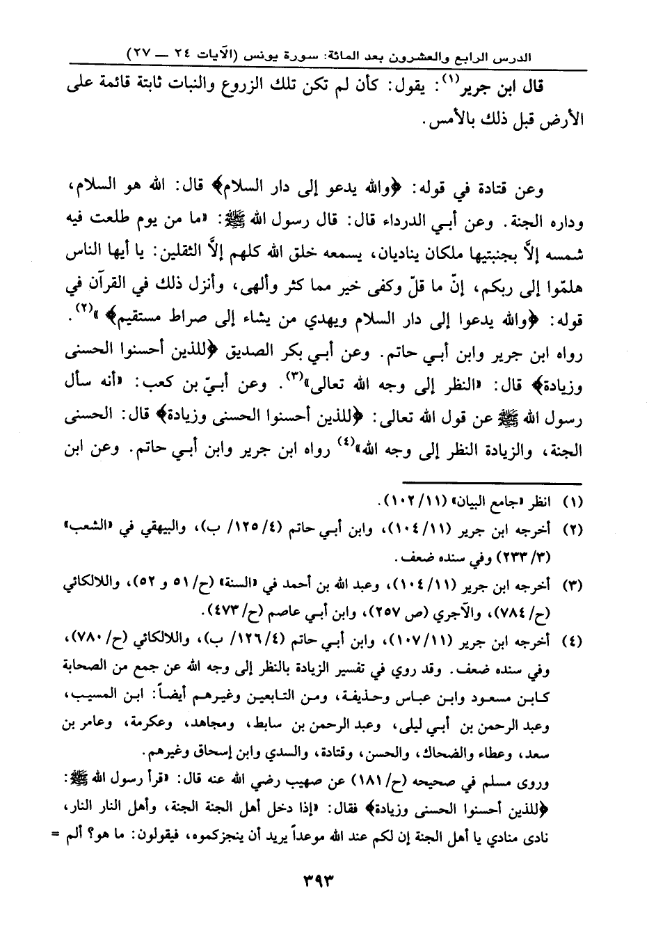 وعن قتادة في قوله: {وَاللهُ يَدْعُو إِلَى دَارِ السَّلاَمِ} ، قال: الله هو السلام، وداره الجنة. وعن أبي الدرداء قال: قال رسول الله - صلى الله عليه وسلم -: «ما من يوم طلعت فيه شمسه إلا بجنتيها ملكان يناديان، يسمعه خلق الله كلهم إلا الثقلين: يا أيها الناس هلمّوا إلى ربكم، إنّ ما قلّ وكفى خير مما كثر وألهى» . وأنزل ذلك في القرآن في قوله: {وَاللهُ يَدْعُو إِلَى دَارِ السَّلاَمِ وَيَهْدِي مَن يَشَاءُ إِلَى صِرَاطٍ مُّسْتَقِيمٍ} . رواه ابن جرير، وابن أبي حاتم. وعن أبي بكر الصديق: {لِّلَّذِينَ أَحْسَنُواْ الْحُسْنَى وَزِيَادَةٌ} ، قال: (النظر