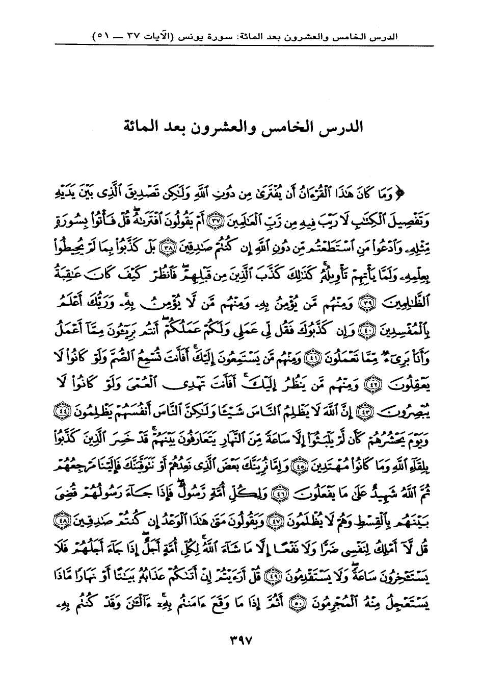 {وَمَا كَانَ هَذَا الْقُرْآنُ أَن يُفْتَرَى مِن دُونِ اللهِ وَلَكِن تَصْدِيقَ الَّذِي بَيْنَ يَدَيْهِ وَتَفْصِيلَ الْكِتَابِ لاَ رَيْبَ فِيهِ مِن رَّبِّ الْعَالَمِينَ (37) أَمْ يَقُولُونَ افْتَرَاهُ قُلْ فَأْتُواْ بِسُورَةٍ مِّثْلِهِ وَادْعُواْ مَنِ اسْتَطَعْتُم مِّن دُونِ اللهِ إِن كُنتُمْ صَادِقِينَ (38) بَلْ كَذَّبُواْ بِمَا لَمْ يُحِيطُواْ بِعِلْمِهِ وَلَمَّا يَأْتِهِمْ تَأْوِيلُهُ كَذَلِكَ كَذَّبَ الَّذِينَ مِن قَبْلِهِمْ فَانظُرْ كَيْفَ كَانَ عَاقِبَةُ الظَّالِمِينَ (39) وَمِنهُم مَّن يُؤْمِنُ بِهِ وَمِنْهُم مَّن لاَّ يُؤْمِنُ بِهِ وَرَبُّكَ أَعْلَمُ بِالْمُفْسِدِينَ (40) وَإِن كَذَّبُوكَ فَقُل لِّي عَمَلِي وَلَكُمْ عَمَلُكُمْ أَنتُمْ بَرِيئُونَ مِمَّا أَعْمَلُ وَأَنَاْ بَرِيءٌ مِّمَّا تَعْمَلُونَ (41) وَمِنْهُم مَّن يَسْتَمِعُونَ إِلَيْكَ أَفَأَنتَ تُسْمِعُ الصُّمَّ وَلَوْ كَانُواْ لاَ يَعْقِلُونَ (42) وَمِنهُم مَّن يَنظُرُ إِلَيْكَ أَفَأَنتَ تَهْدِي الْعُمْيَ وَلَوْ كَانُواْ لاَ يُبْصِرُونَ (43) إِنَّ اللهَ لاَ يَظْلِمُ النَّاسَ شَيْئاً وَلَكِنَّ النَّاسَ أَنفُسَهُمْ يَظْلِمُونَ (44) وَيَوْمَ يَحْشُرُهُمْ كَأَن لَّمْ يَلْبَثُواْ إِلاَّ سَاعَةً مِّنَ النَّهَارِ يَتَعَارَفُونَ بَيْنَهُمْ قَدْ خَسِرَ الَّذِينَ كَذَّبُواْ بِلِقَاء اللهِ وَمَا كَانُواْ مُهْتَدِينَ (45) وَإِمَّا نُرِيَنَّكَ بَعْضَ الَّذِي نَعِدُهُمْ أَوْ نَتَوَفَّيَنَّكَ فَإِلَيْنَا مَرْجِعُهُمْ ثُمَّ اللهُ شَهِيدٌ عَلَى مَا يَفْعَلُونَ (46) وَلِكُلِّ أُمَّةٍ رَّسُولٌ فَإِذَا جَاء رَسُولُهُمْ قُضِيَ بَيْنَهُم بِالْقِسْطِ وَهُمْ لاَ يُظْلَمُونَ (47) وَيَقُولُونَ مَتَى هَذَا الْوَعْدُ إِن كُنتُمْ صَادِقِينَ (48) قُل لاَّ أَمْلِكُ لِنَفْسِي ضَرّاً وَلاَ نَفْعاً إِلاَّ مَا شَاء اللهُ لِكُلِّ أُمَّةٍ أَجَلٌ إِذَا جَاء أَجَلُهُمْ فَلاَ يَسْتَأْخِرُونَ سَاعَةً وَلاَ يَسْتَقْدِمُونَ (49) قُلْ أَرَأَيْتُمْ