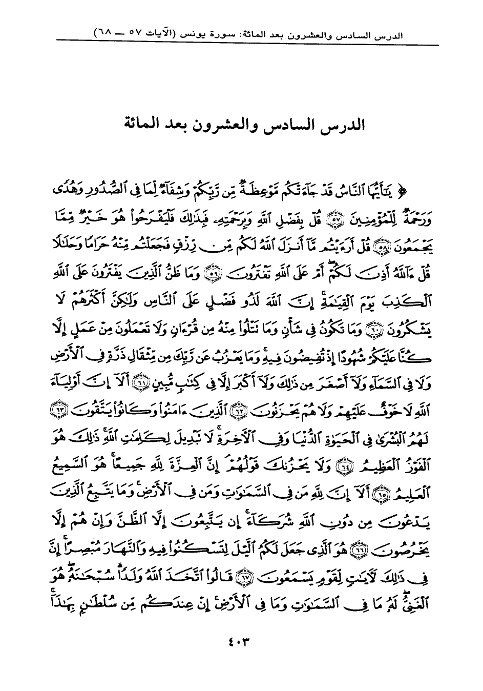 {يَا أَيُّهَا النَّاسُ قَدْ جَاءتْكُم مَّوْعِظَةٌ مِّن رَّبِّكُمْ وَشِفَاء لِّمَا فِي الصُّدُورِ وَهُدًى وَرَحْمَةٌ لِّلْمُؤْمِنِينَ (57) قُلْ بِفَضْلِ اللهِ وَبِرَحْمَتِهِ فَبِذَلِكَ فَلْيَفْرَحُواْ هُوَ خَيْرٌ مِّمَّا يَجْمَعُونَ (58) قُلْ أَرَأَيْتُم مَّا أَنزَلَ اللهُ لَكُم مِّن رِّزْقٍ فَجَعَلْتُم مِّنْهُ حَرَاماً وَحَلاَلاً قُلْ آللهُ أَذِنَ لَكُمْ أَمْ عَلَى اللهِ تَفْتَرُونَ (59) وَمَا ظَنُّ الَّذِينَ يَفْتَرُونَ عَلَى اللهِ الْكَذِبَ يَوْمَ الْقِيَامَةِ إِنَّ اللهَ لَذُو فَضْلٍ عَلَى النَّاسِ وَلَكِنَّ أَكْثَرَهُمْ لاَ يَشْكُرُونَ (60) وَمَا تَكُونُ فِي شَأْنٍ وَمَا تَتْلُو مِنْهُ مِن قُرْآنٍ وَلاَ تَعْمَلُونَ مِنْ عَمَلٍ إِلاَّ كُنَّا عَلَيْكُمْ شُهُوداً إِذْ تُفِيضُونَ فِيهِ وَمَا يَعْزُبُ عَن رَّبِّكَ مِن مِّثْقَالِ ذَرَّةٍ فِي الأَرْضِ وَلاَ فِي السَّمَاء وَلاَ أَصْغَرَ مِن ذَلِكَ وَلا أَكْبَرَ إِلاَّ فِي كِتَابٍ مُّبِينٍ (61) أَلا إِنَّ أَوْلِيَاء اللهِ لاَ خَوْفٌ عَلَيْهِمْ وَلاَ هُمْ يَحْزَنُونَ (62) الَّذِينَ آمَنُواْ وَكَانُواْ يَتَّقُونَ (63) لَهُمُ الْبُشْرَى فِي الْحَياةِ الدُّنْيَا وَفِي الآخِرَةِ لاَ تَبْدِيلَ لِكَلِمَاتِ اللهِ ذَلِكَ هُوَ الْفَوْزُ الْعَظِيمُ (64) وَلاَ يَحْزُنكَ قَوْلُهُمْ إِنَّ الْعِزَّةَ لِلّهِ جَمِيعاً هُوَ السَّمِيعُ الْعَلِيمُ (65) أَلا إِنَّ لِلّهِ مَن فِي السَّمَاوَات وَمَن فِي الأَرْضِ وَمَا يَتَّبِعُ الَّذِينَ يَدْعُونَ مِن دُونِ اللهِ شُرَكَاء إِن يَتَّبِعُونَ إِلاَّ الظَّنَّ وَإِنْ هُمْ إِلاَّ يَخْرُصُونَ (66) هُوَ الَّذِي جَعَلَ لَكُمُ اللَّيْلَ لِتَسْكُنُواْ فِيهِ وَالنَّهَارَ مُبْصِراً إِنَّ فِي ذَلِكَ لآيَاتٍ لِّقَوْمٍ يَسْمَعُونَ (67) قَالُواْ اتَّخَذَ اللهُ وَلَداً سُبْحَانَهُ هُوَ الْغَنِيُّ لَهُ مَا فِي السَّمَاوَات وَمَا فِي الأَرْضِ إِنْ عِندَكُم مِّن سُلْطَانٍ بِهَذَا