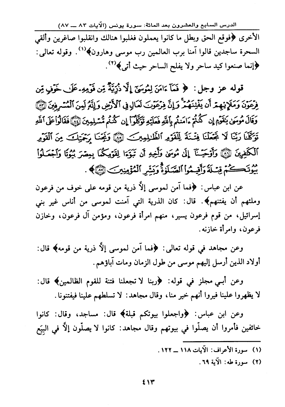 قوله عز وجل: {فَمَا آمَنَ لِمُوسَى إِلاَّ ذُرِّيَّةٌ مِّن قَوْمِهِ عَلَى خَوْفٍ مِّن فِرْعَوْنَ وَمَلَئِهِمْ أَن يَفْتِنَهُمْ وَإِنَّ فِرْعَوْنَ لَعَالٍ فِي الأَرْضِ وَإِنَّهُ لَمِنَ الْمُسْرِفِينَ (83) وَقَالَ مُوسَى يَا قَوْمِ إِن كُنتُمْ آمَنتُم بِاللهِ فَعَلَيْهِ تَوَكَّلُواْ إِن كُنتُم مُّسْلِمِينَ (84) فَقَالُواْ عَلَى اللهِ تَوَكَّلْنَا رَبَّنَا لاَ تَجْعَلْنَا فِتْنَةً لِّلْقَوْمِ الظَّالِمِينَ (85) وَنَجِّنَا بِرَحْمَتِكَ مِنَ الْقَوْمِ الْكَافِرِينَ (86) وَأَوْحَيْنَا إِلَى مُوسَى