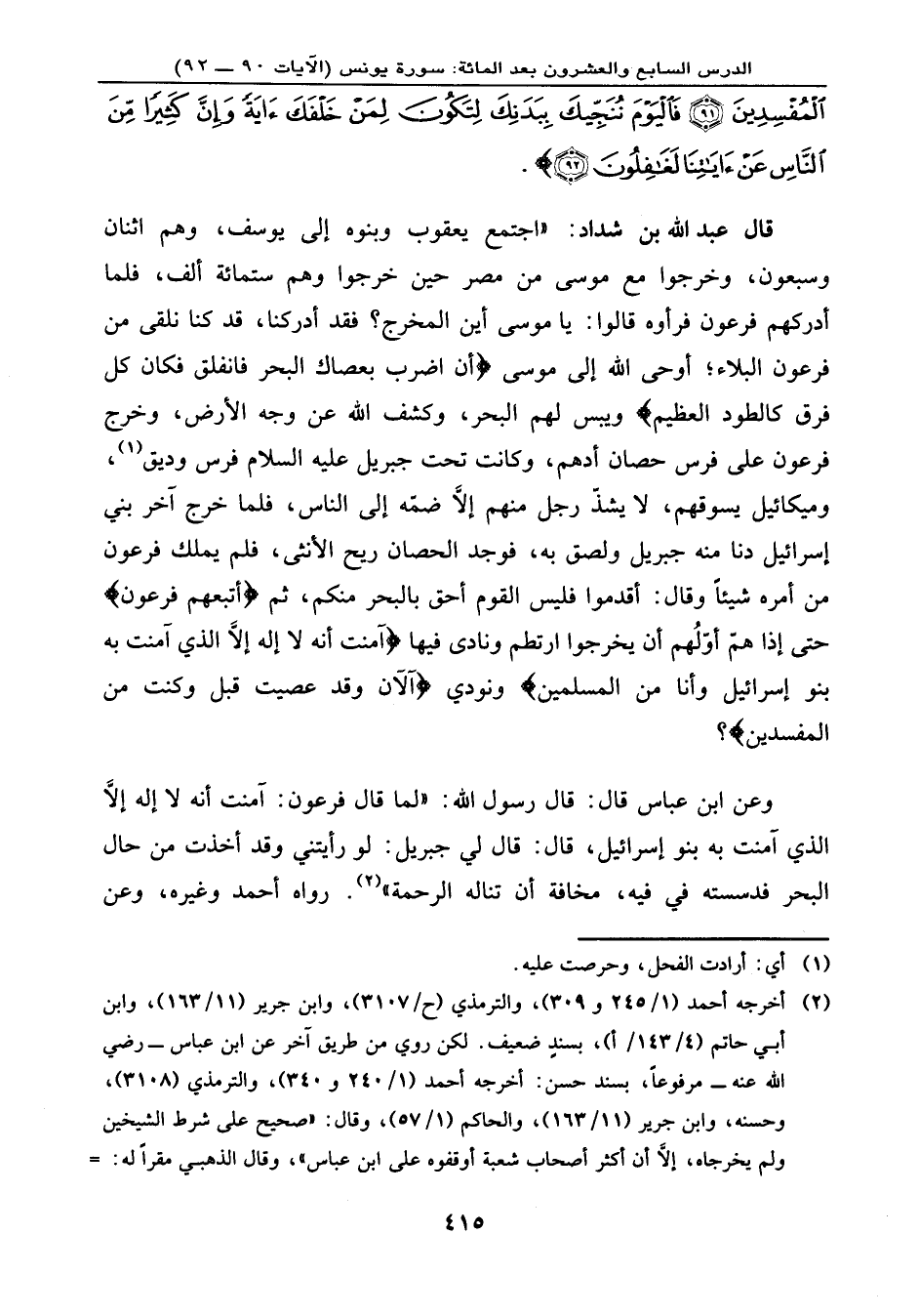 قال عبد الله بن شداد: (اجتمع يعقوب وبنوه إلى يوسف، وهم اثنان وسبعون، وخرجوا مع موسى من مصر حين خرجوا وهم ستمائة ألف، فلما أدركهم فرعون فرأوه قالوا: يا موسى أين المخرج؟ فقد أدركنا، قد كنا نلقى من فرعون البلاء؛ أوحى الله إلى موسى: {أَنِ اضْرِب بِّعَصَاكَ الْبَحْرَ فَانفَلَقَ فَكَانَ كُلُّ فِرْقٍ كَالطَّوْدِ الْعَظِيمِ} ويبس لهم البحر، وكشف الله عن وجه الأرض، وخرج فرعون على فرس حصان أدهم، وكانت تحت جبريل عليه السلام فرس وديق، وميكائيل يسوقهم، لا يشذّ رجل منهم إلا ضمه إلى الناس، فلما خرج آخر بني إسرائيل دنا منه جبريل ولصق به، فوجد الحصان ريح الأنثى، فلم يملك فرعون من أمره شيئًا وقال: أقدموا فليس القوم أحق بالبحر منكم، ثم أتبعهم فرعون حتى إذا همّ أوّلُهم أن يخرجوا ارتطم ونادى فيها: {آمَنتُ أَنَّهُ لا إِلِهَ إِلاَّ الَّذِي آمَنَتْ بِهِ بَنُو إِسْرَائِيلَ وَأَنَاْ مِنَ الْمُسْلِمِينَ} ونودي: {آلآنَ وَقَدْ عَصَيْتَ قَبْلُ وَكُنتَ مِنَ الْمُفْسِدِينَ} ؟ .