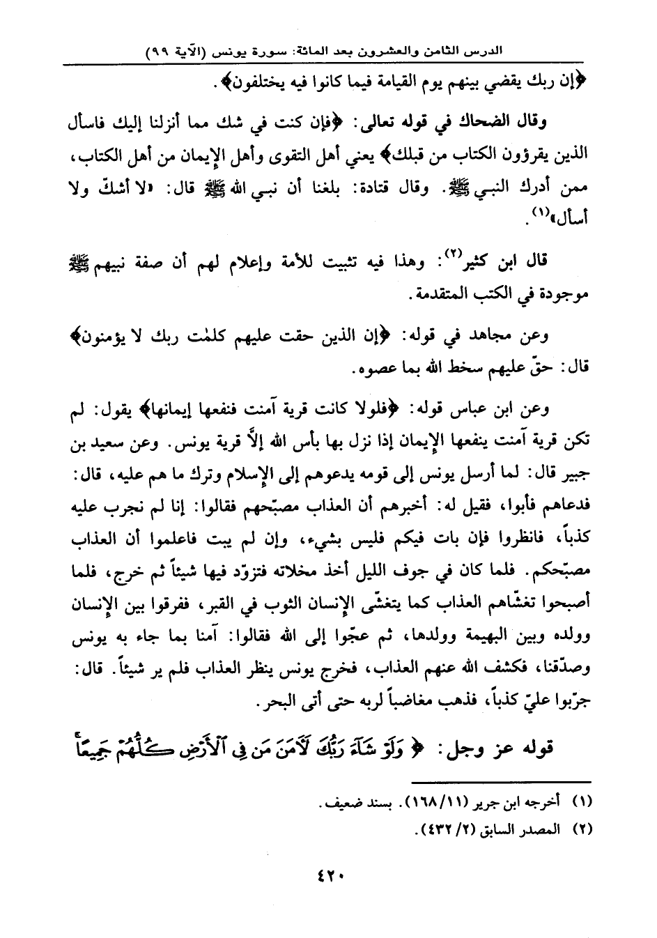 وقال الضحاك في قوله تعالى: {فَإِن كُنتَ فِي شَكٍّ مِّمَّا أَنزَلْنَا إِلَيْكَ فَاسْأَلِ الَّذِينَ يَقْرَؤُونَ الْكِتَابَ مِن قَبْلِكَ} ، يعني: أهل التقوى وأهل اليمان من أهل الكتاب ممن أدرك النبي - صلى الله عليه وسلم -. وقال قتادة: بلغنا أن نبي الله - صلى الله عليه وسلم - قال: «لا أشكّ ولا أسأل» .