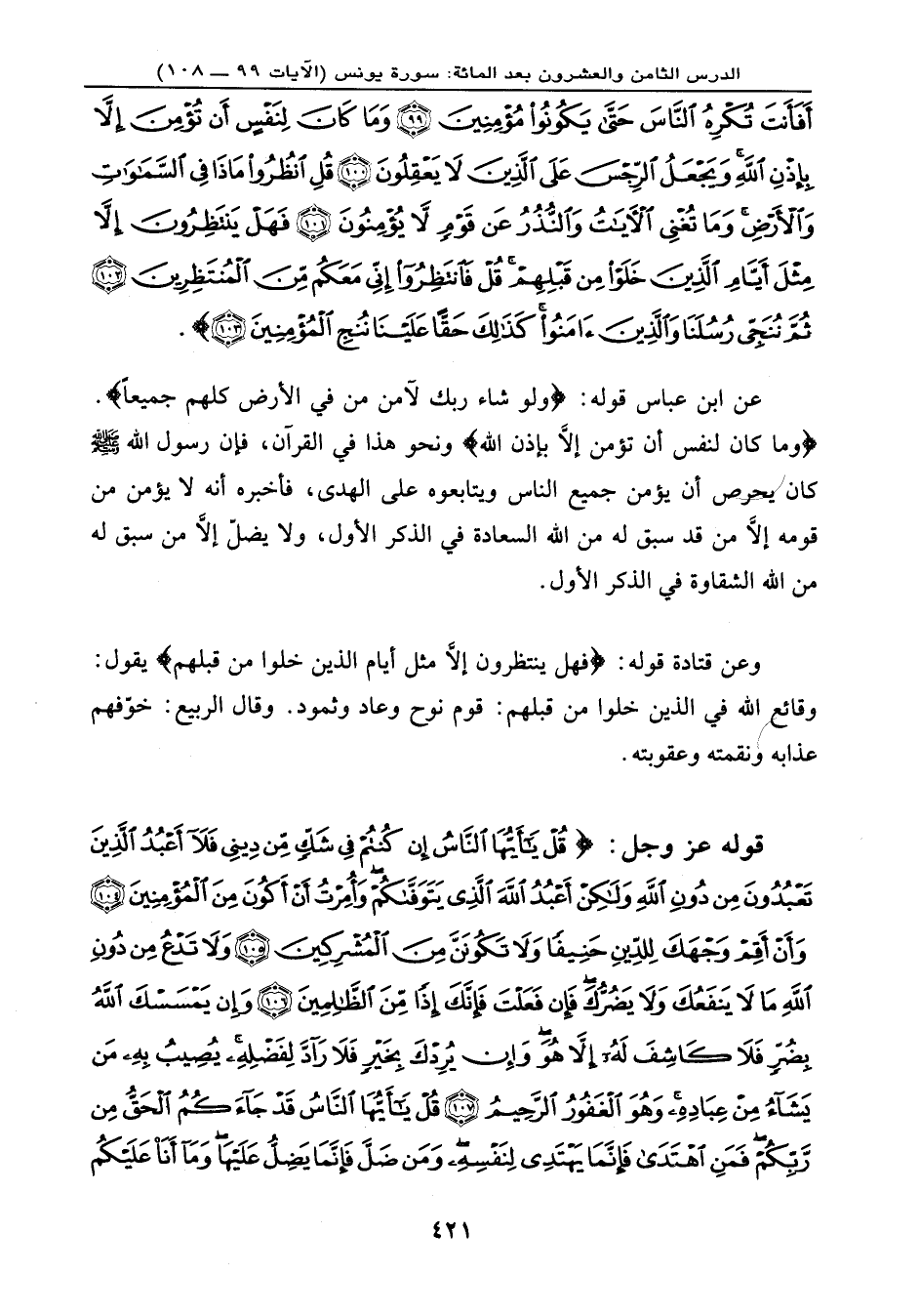 قوله عز وجل: {قُلْ يَا أَيُّهَا النَّاسُ إِن كُنتُمْ فِي شَكٍّ مِّن دِينِي فَلاَ أَعْبُدُ الَّذِينَ تَعْبُدُونَ مِن دُونِ اللهِ وَلَكِنْ أَعْبُدُ اللهَ الَّذِي يَتَوَفَّاكُمْ وَأُمِرْتُ أَنْ أَكُونَ مِنَ الْمُؤْمِنِينَ (104) وَأَنْ أَقِمْ وَجْهَكَ لِلدِّينِ حَنِيفاً وَلاَ تَكُونَنَّ مِنَ الْمُشْرِكِينَ (105) وَلاَ تَدْعُ مِن دُونِ اللهِ مَا لاَ يَنفَعُكَ وَلاَ يَضُرُّكَ فَإِن فَعَلْتَ فَإِنَّكَ إِذاً مِّنَ الظَّالِمِينَ (106) وَإِن يَمْسَسْكَ اللهُ بِضُرٍّ فَلاَ كَاشِفَ لَهُ إِلاَّ هُوَ وَإِن يُرِدْكَ بِخَيْرٍ فَلاَ رَآدَّ لِفَضْلِهِ يُصَيبُ بِهِ مَن يَشَاءُ مِنْ عِبَادِهِ وَهُوَ الْغَفُورُ الرَّحِيمُ (107) قُلْ يَا أَيُّهَا النَّاسُ قَدْ جَاءكُمُ الْحَقُّ مِن رَّبِّكُمْ فَمَنِ اهْتَدَى فَإِنَّمَا يَهْتَدِي لِنَفْسِهِ وَمَن ضَلَّ فَإِنَّمَا يَضِلُّ عَلَيْهَا وَمَا أَنَاْ عَلَيْكُم