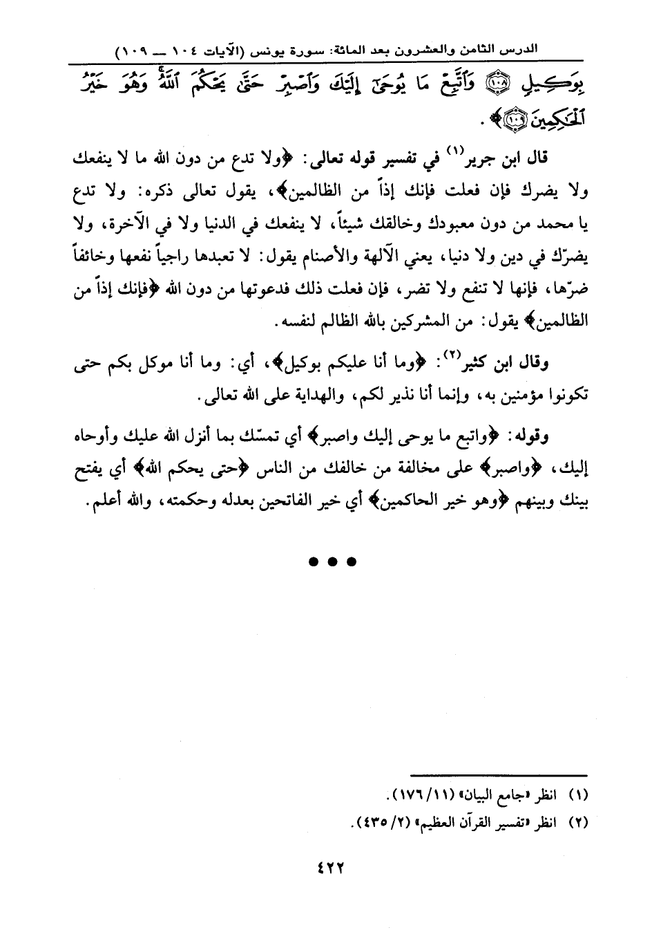 قال ابن جرير في تفسير قوله تعالى: {وَلاَ تَدْعُ مِن دُونِ اللهِ مَا لاَ يَنفَعُكَ وَلاَ يَضُرُّكَ فَإِن فَعَلْتَ فَإِنَّكَ إِذاً مِّنَ الظَّالِمِينَ} ، يقول تعالى ذكره: ولا تدع يا محمد من دون معبودك وخالقك شيئًا لا ينفعك في الدنيا ولا في الآخرة، ولا يضرك في دين ولا دنيا، يعني: الآلهة والأصنام يقول: لا تعبدها راجيًا نفعها وخائفًا ضرها، فإنها لا تنفع ولا تضر، فإن فعلت ذلك فدعوتها من دون الله، {فَإِنَّكَ إِذاً مِّنَ الظَّالِمِينَ} ، يقول: من المشركين بالله الظالم لنفسه.