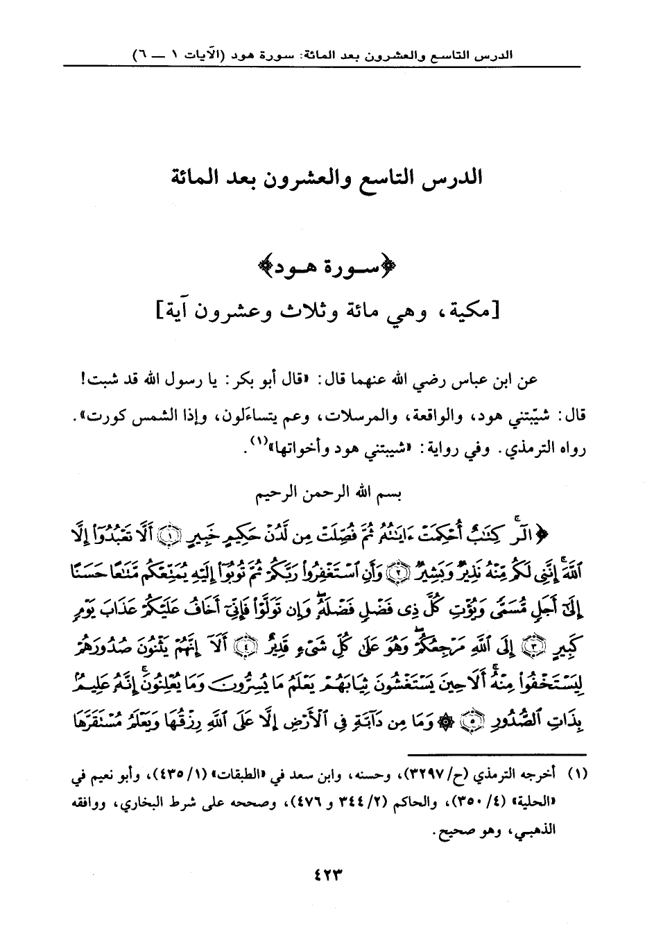 {آلَر كِتَابٌ أُحْكِمَتْ آيَاتُهُ ثُمَّ فُصِّلَتْ مِن لَّدُنْ حَكِيمٍ خَبِيرٍ (1) أَلاَّ تَعْبُدُواْ إِلاَّ اللهَ إِنَّنِي لَكُم مِّنْهُ نَذِيرٌ وَبَشِيرٌ (2) وَأَنِ اسْتَغْفِرُواْ رَبَّكُمْ ثُمَّ تُوبُواْ إِلَيْهِ يُمَتِّعْكُم مَّتَاعاً حَسَناً إِلَى أَجَلٍ مُّسَمًّى وَيُؤْتِ كُلَّ ذِي فَضْلٍ فَضْلَهُ وَإِن تَوَلَّوْاْ فَإِنِّيَ أَخَافُ عَلَيْكُمْ عَذَابَ يَوْمٍ كَبِيرٍ (3) إِلَى اللهِ مَرْجِعُكُمْ وَهُوَ عَلَى كُلِّ شَيْءٍ قَدِيرٌ (4) أَلا إِنَّهُمْ يَثْنُونَ صُدُورَهُمْ لِيَسْتَخْفُواْ مِنْهُ أَلا حِينَ يَسْتَغْشُونَ ثِيَابَهُمْ يَعْلَمُ مَا يُسِرُّونَ وَمَا يُعْلِنُونَ إِنَّهُ عَلِيمٌ بِذَاتِ الصُّدُورِ (5) وَمَا مِن دَآبَّةٍ فِي الأَرْضِ إِلاَّ عَلَى اللهِ رِزْقُهَا وَيَعْلَمُ مُسْتَقَرَّهَا