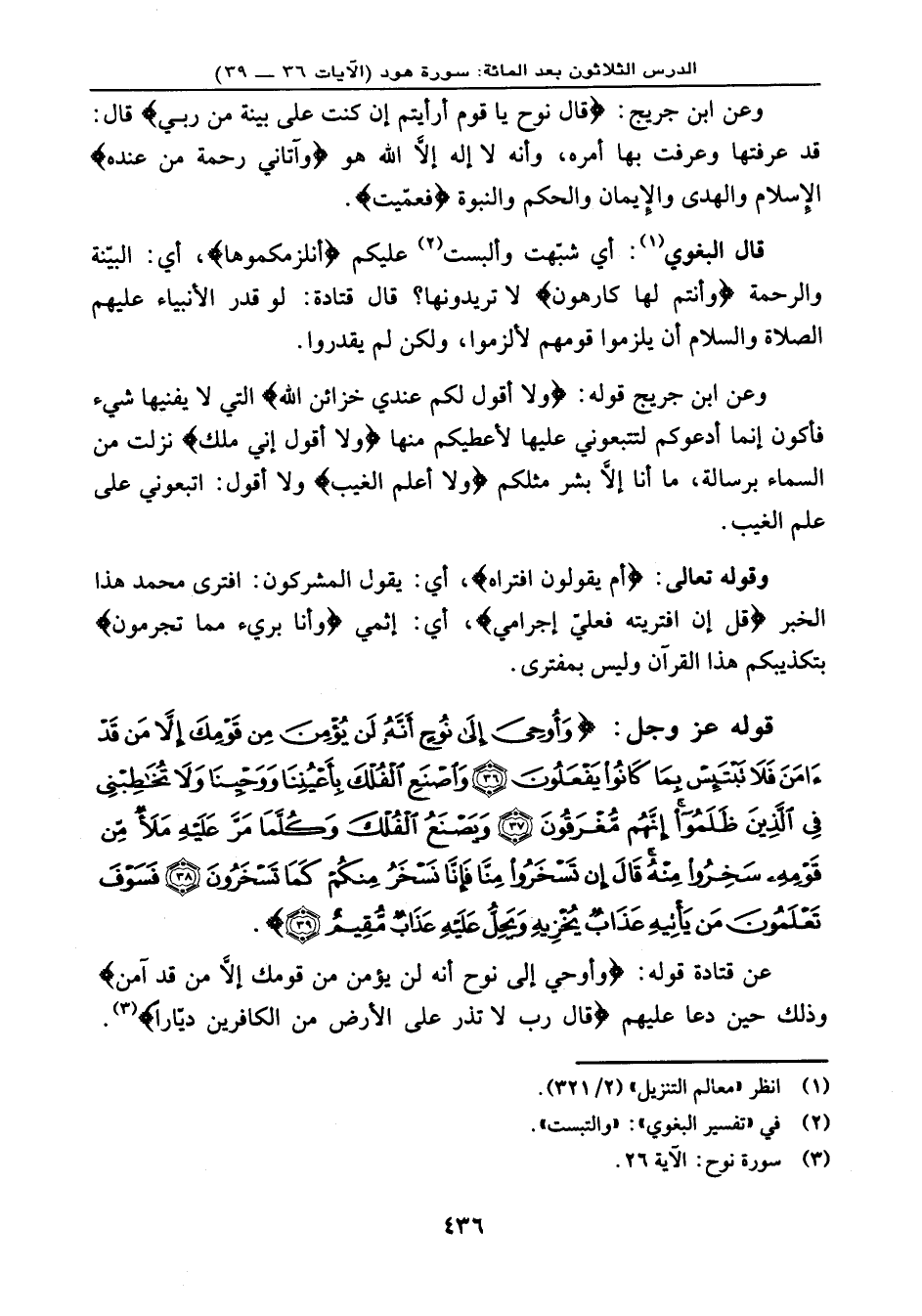 وعن ابن جريج: قال نوح: {يَا قَوْمِ أَرَأَيْتُمْ إِن كُنتُ عَلَى بَيِّنَةٍ مِّن رَّبِّيَ} قال: قد عرفتها وعرفت بها أمره، وأنه لا إله إلا الله هو {وَآتَانِي رَحْمَةً مِّنْ عِندِهِ} الإسلام والهدى والإيمان والحكم والنبوة. {فَعُمِّيَتْ} .