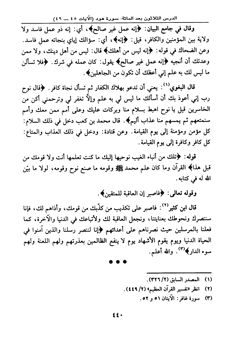 قال البغوي: يعني: أن تدعوا بهلاك الكفار ثم تسأل نجاة كافر. {قَالَ رَبِّ إِنِّي أَعُوذُ بِكَ أَنْ أَسْأَلَكَ مَا لَيْسَ لِي بِهِ عِلْمٌ وَإِلاَّ تَغْفِرْ لِي وَتَرْحَمْنِي أَكُن مِّنَ الْخَاسِرِينَ * قِيلَ يَا نُوحُ اهْبِطْ بِسَلاَمٍ مِّنَّا وَبَركَاتٍ عَلَيْكَ وَعَلَى أُمَمٍ مِّمَّن مَّعَكَ وَأُمَمٌ سَنُمَتِّعُهُمْ ثُمَّ يَمَسُّهُم مِّنَّا عَذَابٌ أَلِيمٌ} . قال محمد بن كعب دخل في ذلك السلام: كل مؤمن ومؤمنة إلى يوم القيامة. وعن قتادة: ودخل في ذلك العذاب والمتاع: كل كافر وكافرة إلى يوم القيامة.