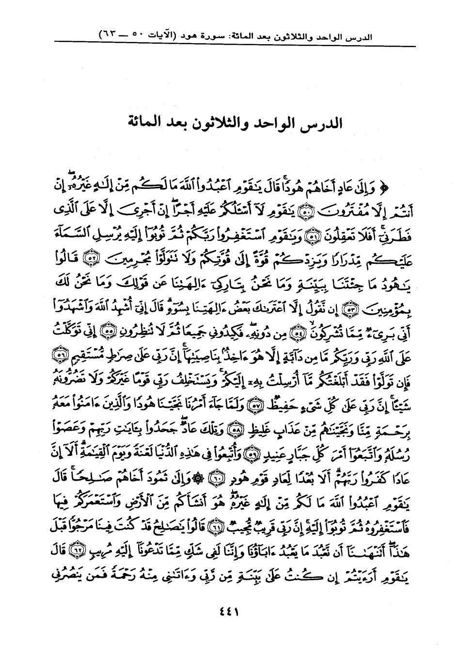{وَإِلَى عَادٍ أَخَاهُمْ هُوداً قَالَ يَا قَوْمِ اعْبُدُواْ اللهَ مَا لَكُم مِّنْ إِلَهٍ غَيْرُهُ إِنْ أَنتُمْ إِلاَّ مُفْتَرُونَ (50) يَا قَوْمِ لا أَسْأَلُكُمْ عَلَيْهِ أَجْراً إِنْ أَجْرِيَ إِلاَّ عَلَى الَّذِي فَطَرَنِي أَفَلاَ تَعْقِلُونَ (51) وَيَا قَوْمِ اسْتَغْفِرُواْ رَبَّكُمْ ثُمَّ تُوبُواْ إِلَيْهِ يُرْسِلِ السَّمَاء عَلَيْكُم مِّدْرَاراً وَيَزِدْكُمْ قُوَّةً إِلَى قُوَّتِكُمْ وَلاَ تَتَوَلَّوْاْ مُجْرِمِينَ (52) قَالُواْ يَا هُودُ مَا جِئْتَنَا بِبَيِّنَةٍ وَمَا نَحْنُ بِتَارِكِي آلِهَتِنَا عَن قَوْلِكَ وَمَا نَحْنُ لَكَ بِمُؤْمِنِينَ (53) إِن نَّقُولُ إِلاَّ اعْتَرَاكَ بَعْضُ آلِهَتِنَا بِسُوَءٍ قَالَ إِنِّي أُشْهِدُ اللهِ وَاشْهَدُواْ أَنِّي بَرِيءٌ مِّمَّا تُشْرِكُونَ (54) مِن دُونِهِ فَكِيدُونِي جَمِيعاً ثُمَّ لاَ تُنظِرُونِ (55) إِنِّي تَوَكَّلْتُ عَلَى اللهِ رَبِّي وَرَبِّكُم مَّا مِن دَآبَّةٍ إِلاَّ هُوَ آخِذٌ بِنَاصِيَتِهَا إِنَّ رَبِّي عَلَى صِرَاطٍ مُّسْتَقِيمٍ (56) فَإِن تَوَلَّوْاْ فَقَدْ أَبْلَغْتُكُم مَّا أُرْسِلْتُ بِهِ إِلَيْكُمْ وَيَسْتَخْلِفُ رَبِّي قَوْماً غَيْرَكُمْ وَلاَ تَضُرُّونَهُ شَيْئاً إِنَّ رَبِّي عَلَىَ كُلِّ شَيْءٍ حَفِيظٌ (57) وَلَمَّا جَاء أَمْرُنَا نَجَّيْنَا هُوداً وَالَّذِينَ آمَنُواْ مَعَهُ بِرَحْمَةٍ مِّنَّا وَنَجَّيْنَاهُم مِّنْ عَذَابٍ غَلِيظٍ (58) وَتِلْكَ عَادٌ جَحَدُواْ بِآيَاتِ رَبِّهِمْ وَعَصَوْاْ رُسُلَهُ وَاتَّبَعُواْ أَمْرَ كُلِّ جَبَّارٍ عَنِيدٍ (59) وَأُتْبِعُواْ فِي هَذِهِ الدُّنْيَا لَعْنَةً وَيَوْمَ الْقِيَامَةِ أَلا إِنَّ عَاداً كَفَرُواْ رَبَّهُمْ أَلاَ بُعْداً لِّعَادٍ قَوْمِ هُودٍ (60) وَإِلَى ثَمُودَ أَخَاهُمْ صَالِحاً قَالَ يَا قَوْمِ اعْبُدُواْ اللهَ مَا لَكُم مِّنْ إِلَهٍ غَيْرُهُ هُوَ أَنشَأَكُم مِّنَ الأَرْضِ وَاسْتَعْمَرَكُمْ فِيهَا فَاسْتَغْفِرُوهُ ثُمَّ تُوبُواْ إِلَيْهِ إِنَّ رَبِّي قَرِيبٌ مُّجِيبٌ (61) قَالُواْ يَا صَالِحُ قَدْ كُنتَ فِينَا مَرْجُوّاً قَبْلَ